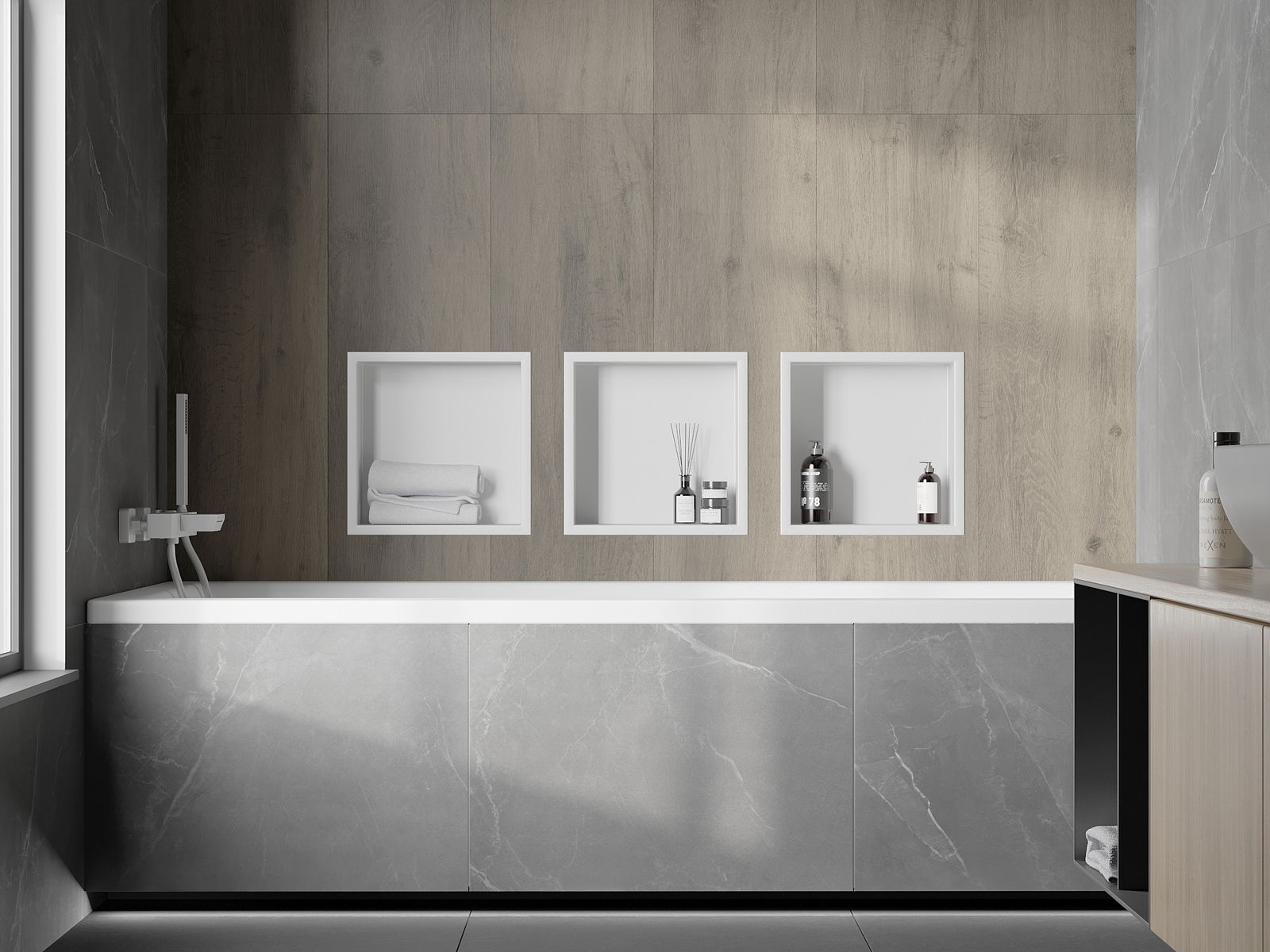 Mahdollisuus asentaa seinään tai erityisesti valmistettuun rakenteeseen. Tämä on erittäin moderni ja toiminnallinen ratkaisu, joka mahdollistaa tilan säästämisen sekä tuotteen sovittamisen sisustuksen estetiikkaan luoden yhtenäisen kokonaisuuden.