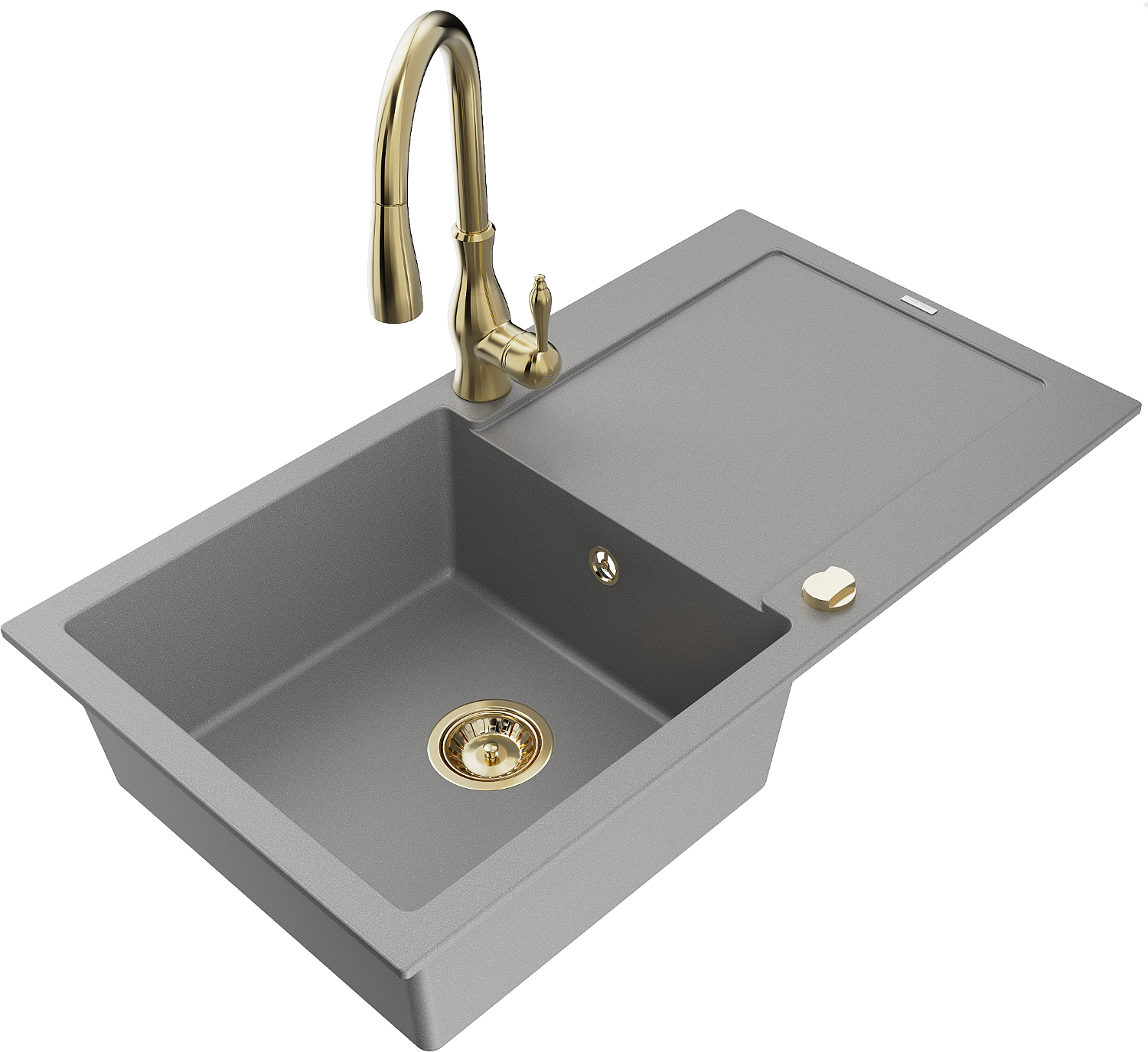 Mexen Leo graniittinen yksi-allas keittiöallas valutustasolla ja keittiöhana Savita, harmaa - 6501-71-672601-50