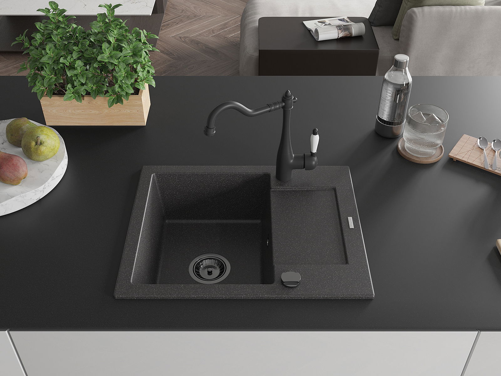 Mexen Enzo graniittinen 1-allas keittiöallas valutustasolla ja keittiöhanalla Carla, musta täplikäs - 6506-76-670700-70-B