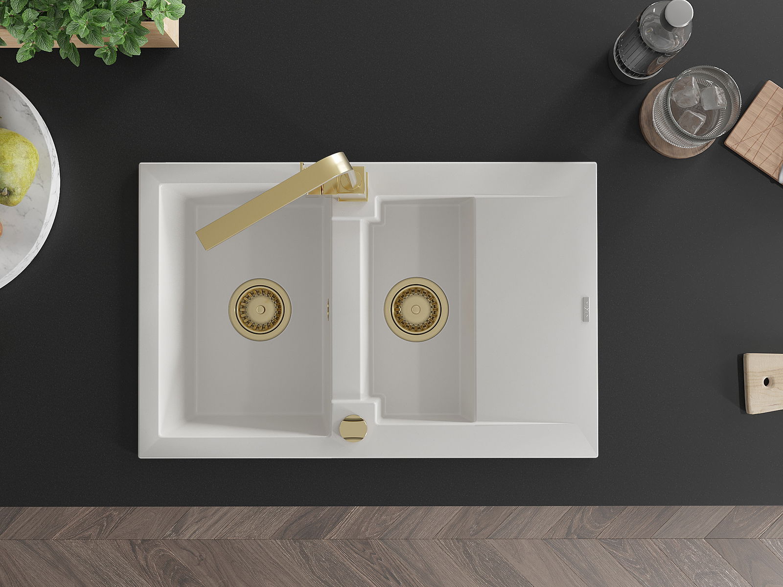 Mexen Gaspar Graniittinen 1,5-osainen keittiöallas työtasolla ja Ritan keittiöhana, valkoinen - 6507-20-670300-50