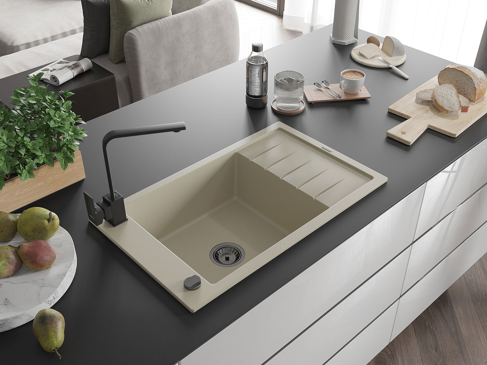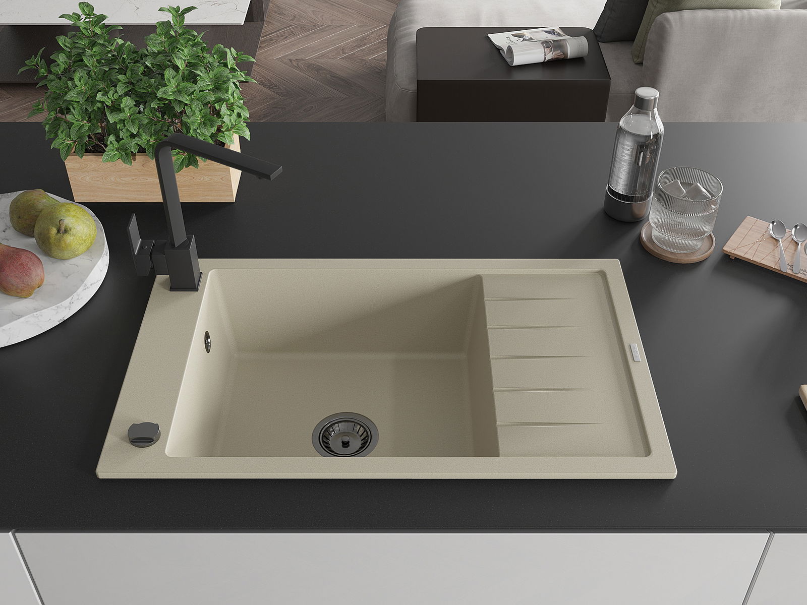 Mexen Elias graniittinen 1-allas keittiöallas valumalla ja keittiöhanalla Rita, beige - 6511-69-670300-70
