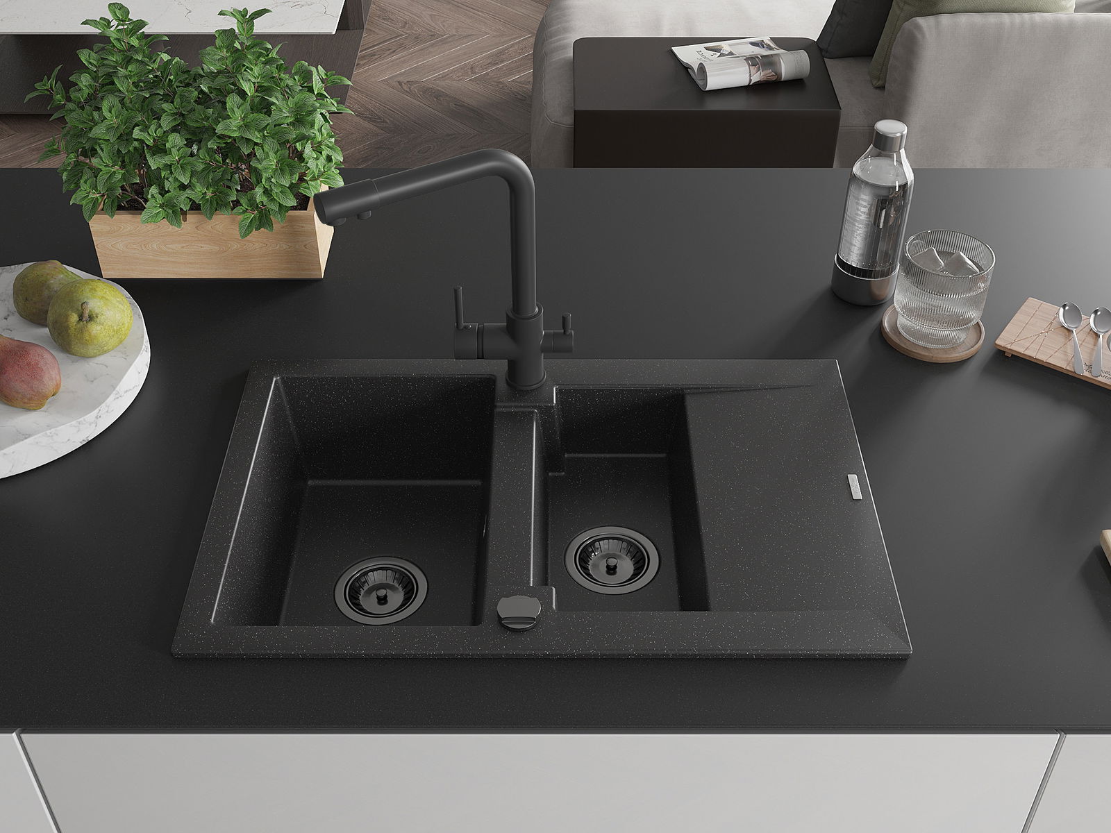 Mexen Gaspar graniittinen 1,5-altainen tiskiallas valutustasolla ja keittiöhana Duero, musta/hopea - 6507-73-671600-70-B