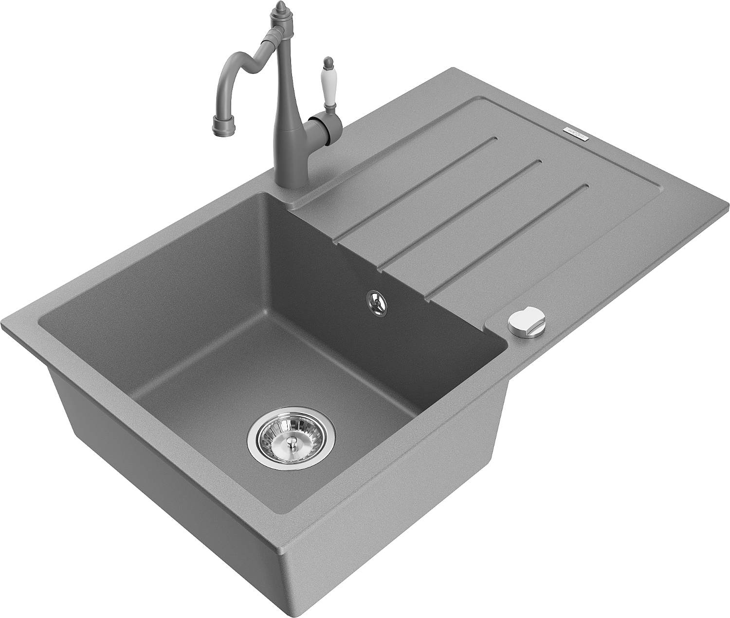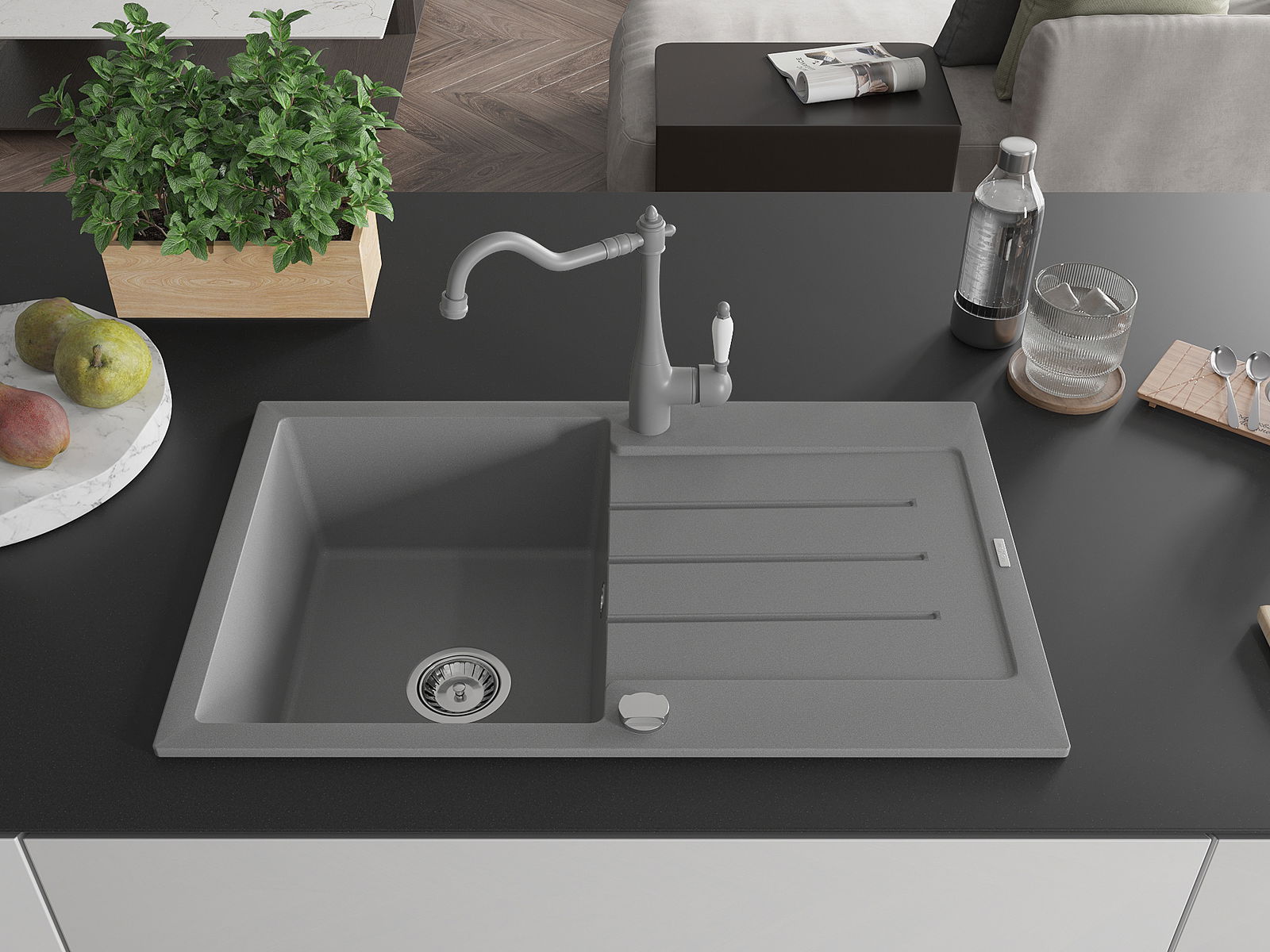 Mexen Bruno graniittinen 1-allas keittiöallas valutuslaudalla ja keittiöhanalla Carla, harmaa - 6513-71-670700-71