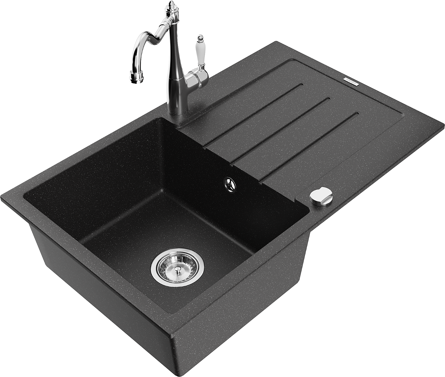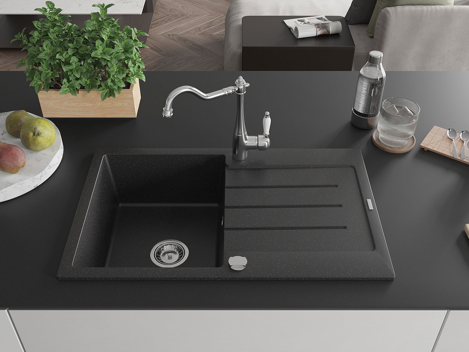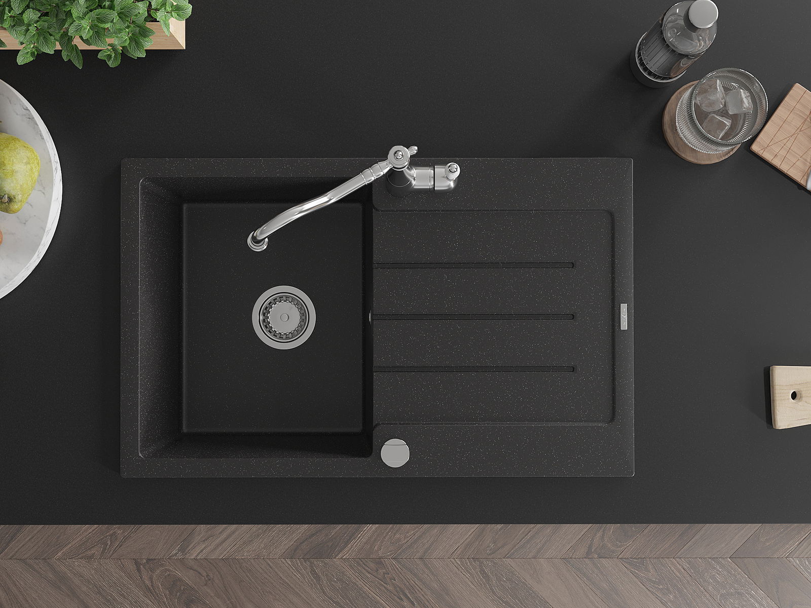 Mexen Bruno graniittinen 1-altainen allas valutustasolla ja keittiöhana Carla, musta/hopeametalliväri - 6513-73-670700-00