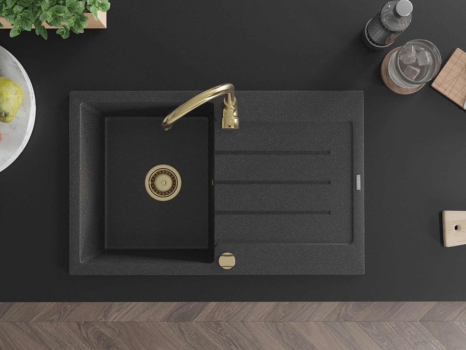 Mexen Bruno graniittinen yksialtainen pesuallas valutustasolla ja Telma-keittiöhana, musta pilkullinen - 6513-76-670200-50