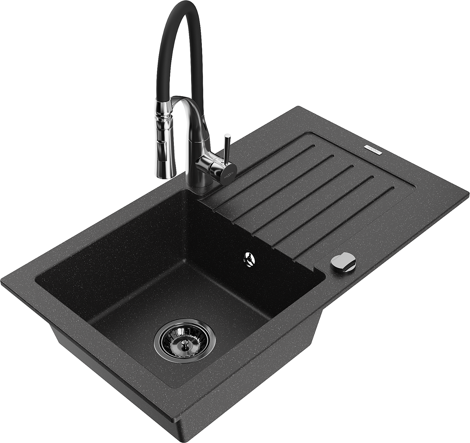 Mexen Pablo Graniittinen 1-allas keittiöallas valutusalueella ja keittiöhana Aster, musta/hopeametalli - 6510-73-73450-07-B