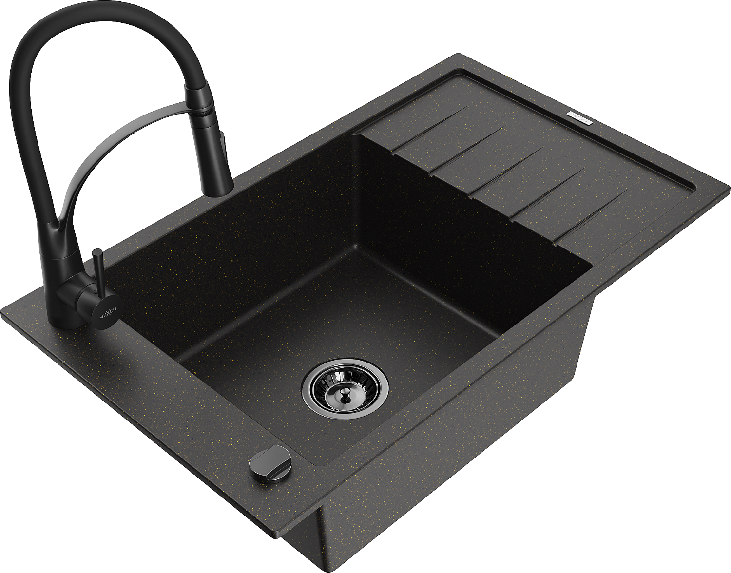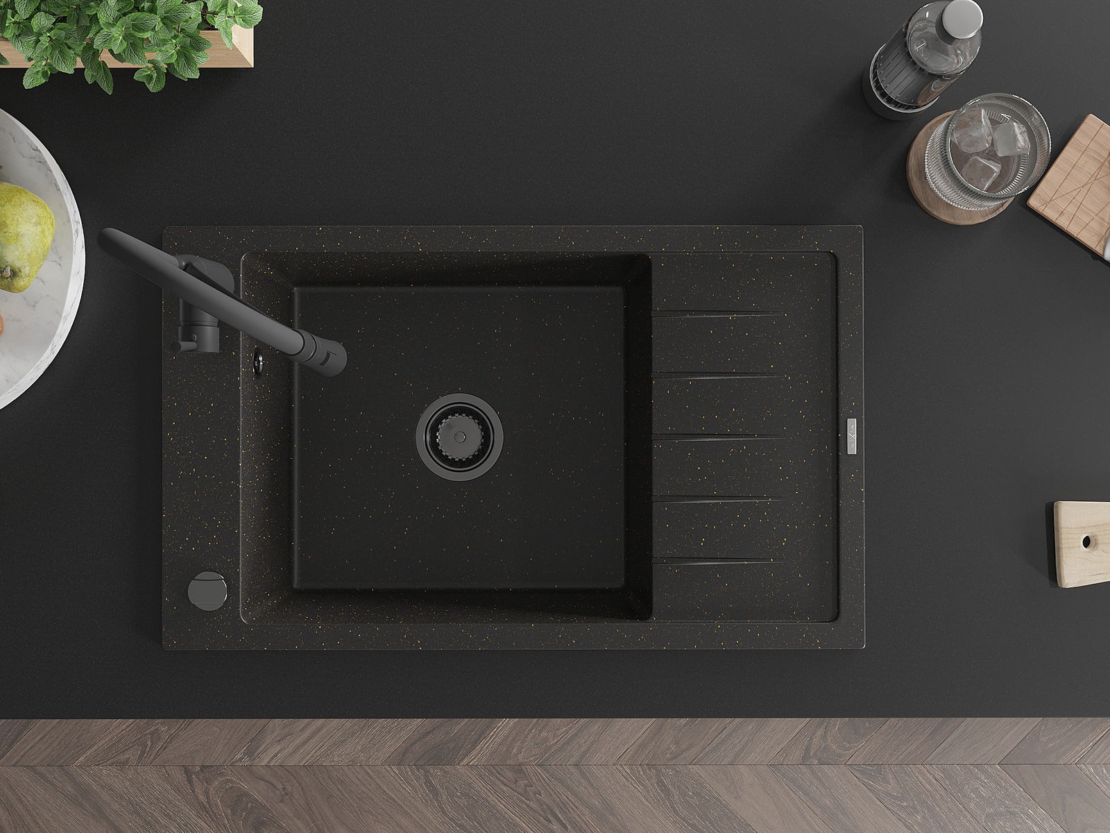 Mexen Elias graniittinen 1-altainen keittiöallas valutustasolla ja keittiöhanalla Aster, musta/kultainen metalli