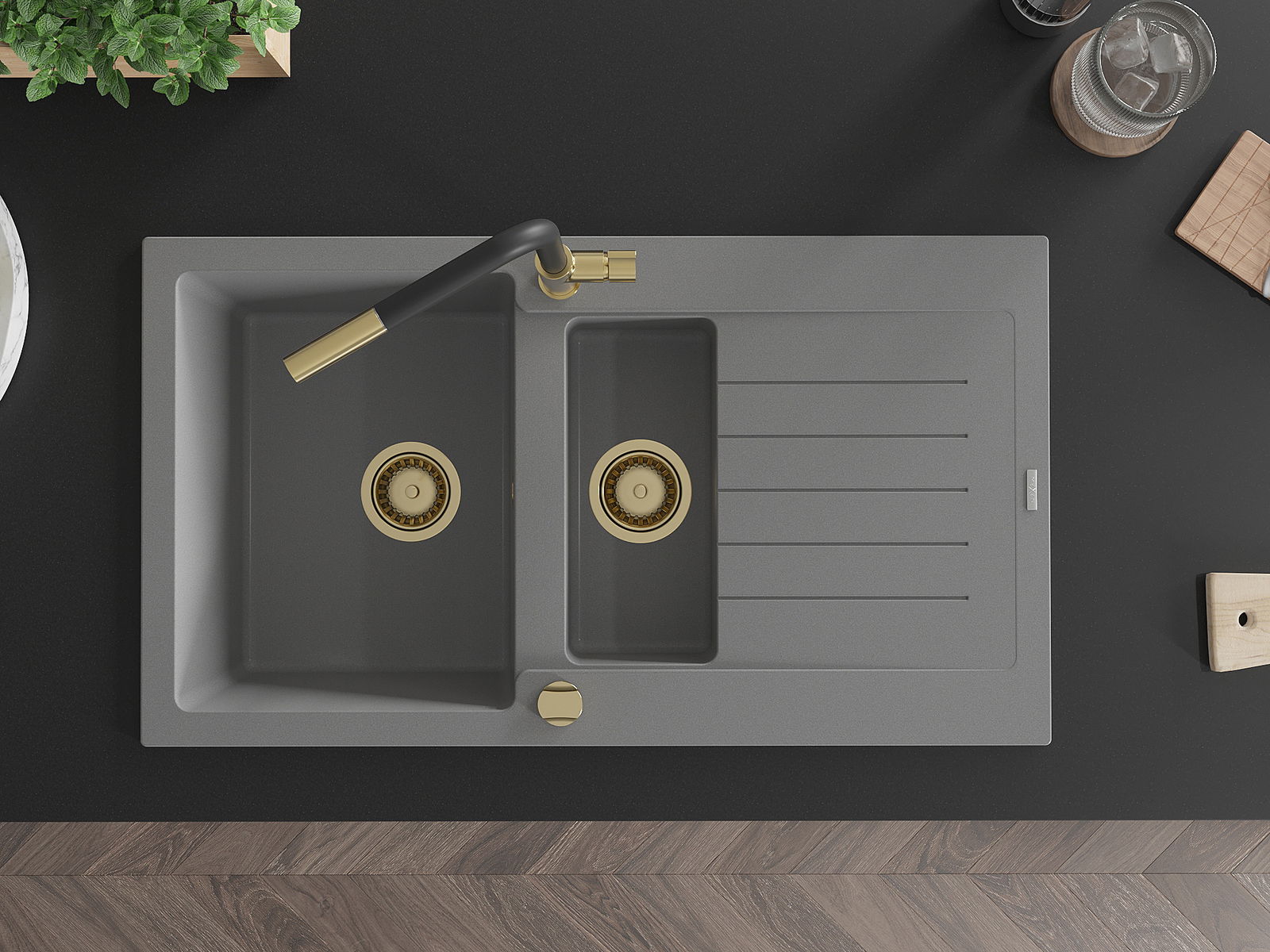 Mexen Matias 1,5-osainen graniittinen pesuallas valutustasolla ja Flora keittiöhana, harmaa - 6502-71-670401-57-G