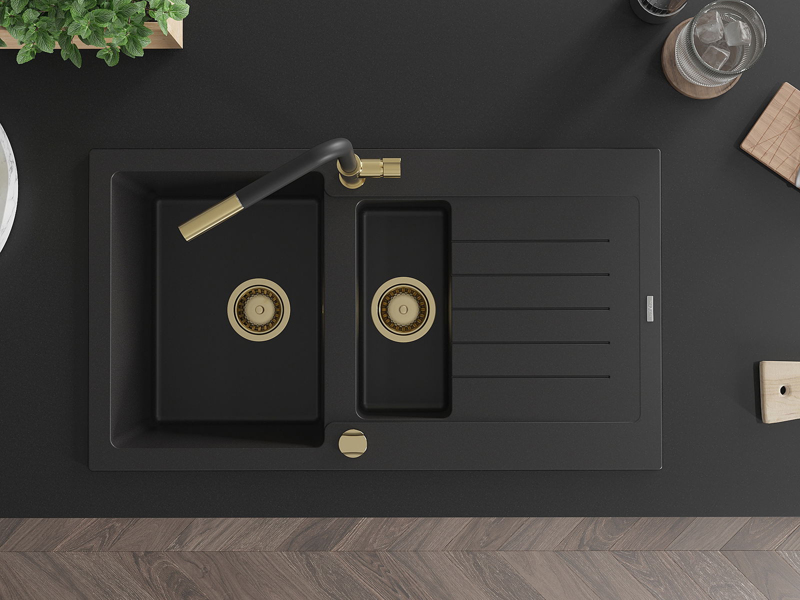 Mexen Matias 1,5-astianpesuallas työtasolle asennettavalla valutustasolla ja Flora keittiöhanalla, musta - 6502-77-670401-57-G