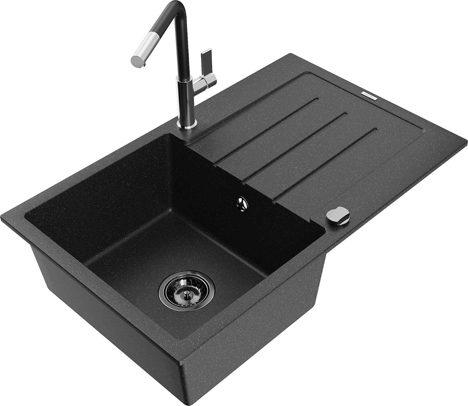 Mexen Bruno Graniittinen 1-osainen keittiöallas valutusalueella ja Flora-keittiöhana, musta/hopean metallinen