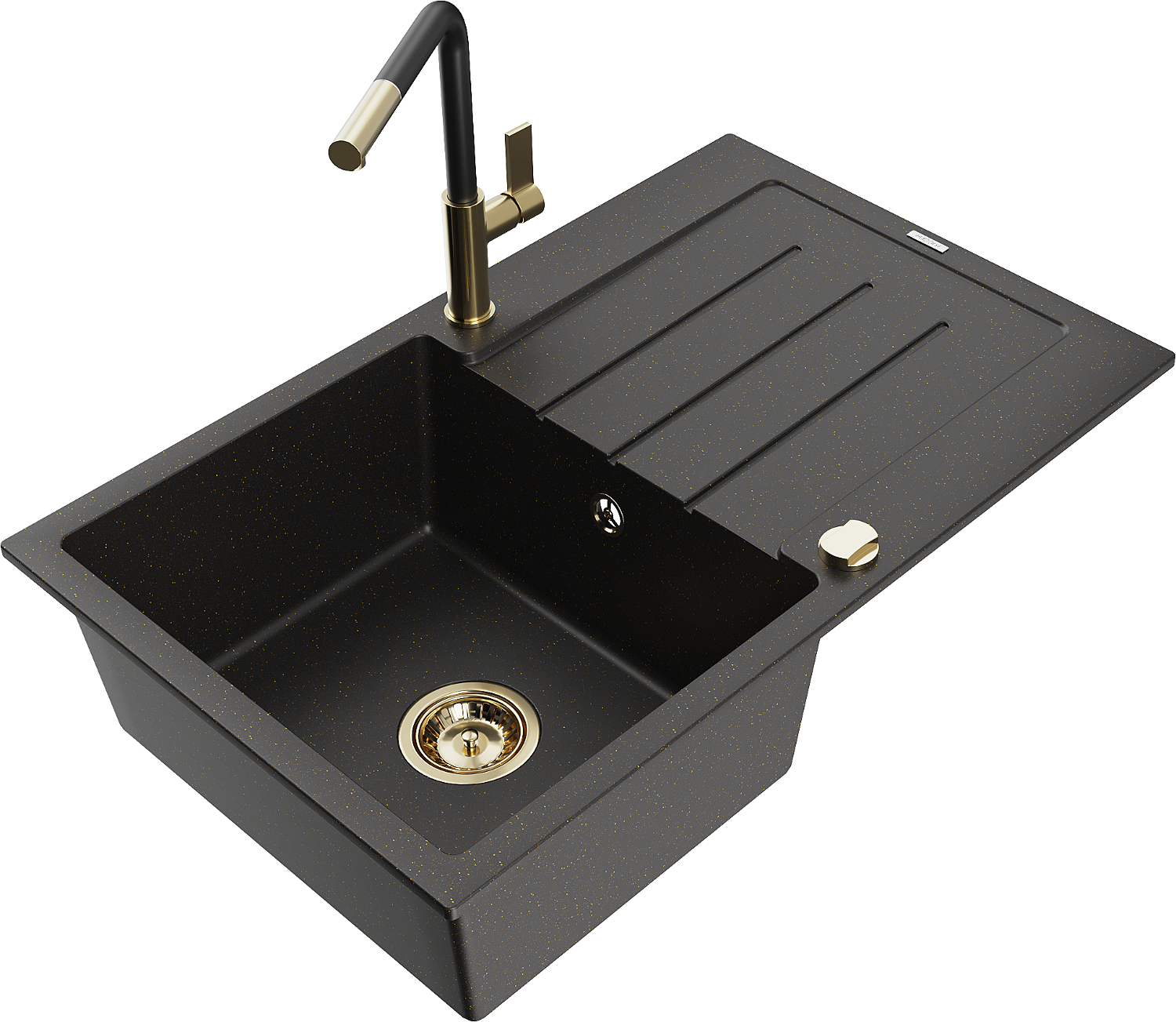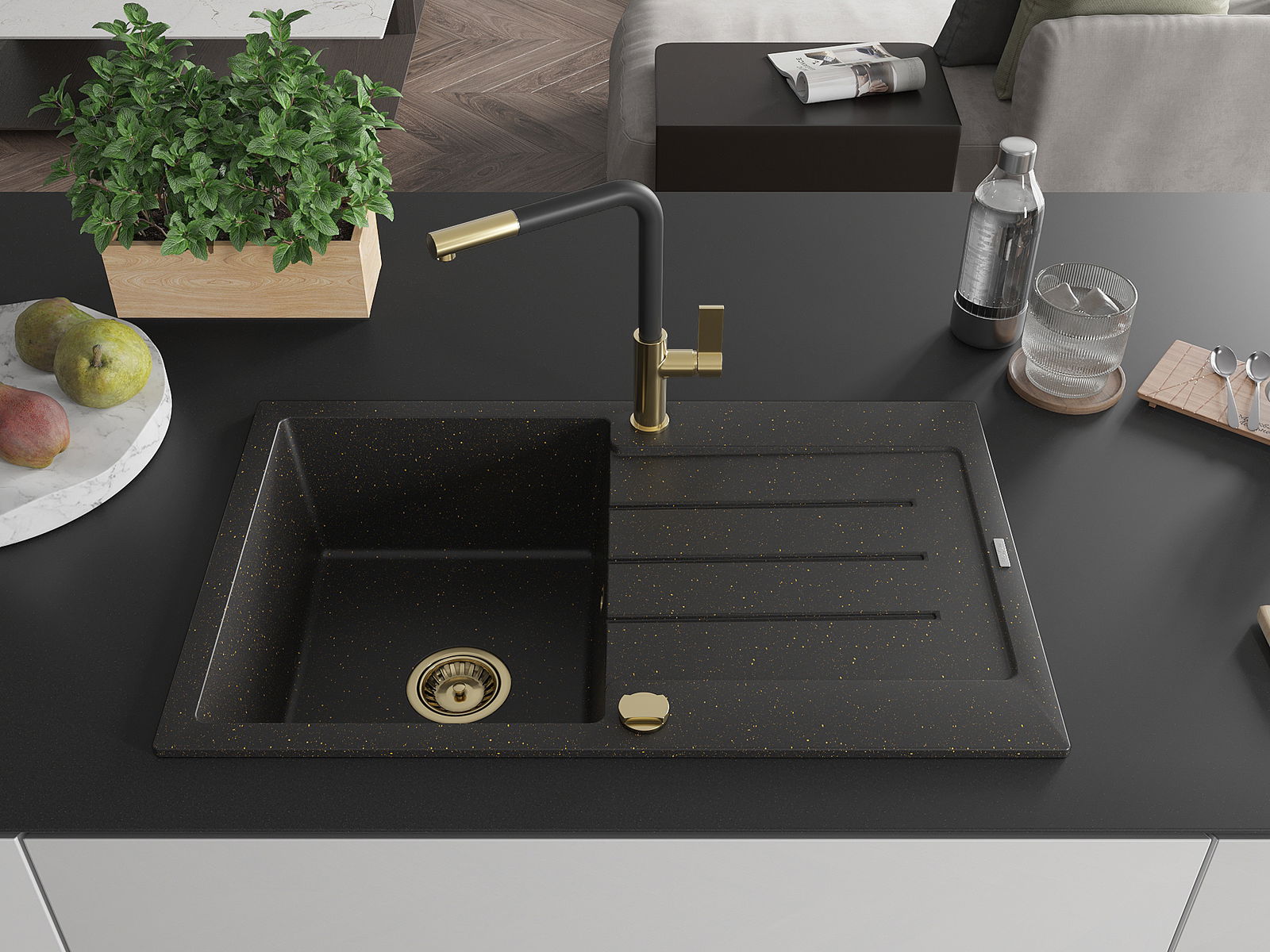 Mexen Bruno graniittinen 1-allas pesuallas kuivaustelineellä ja keittiöhanalla Flora, musta/kullalla metallihohto