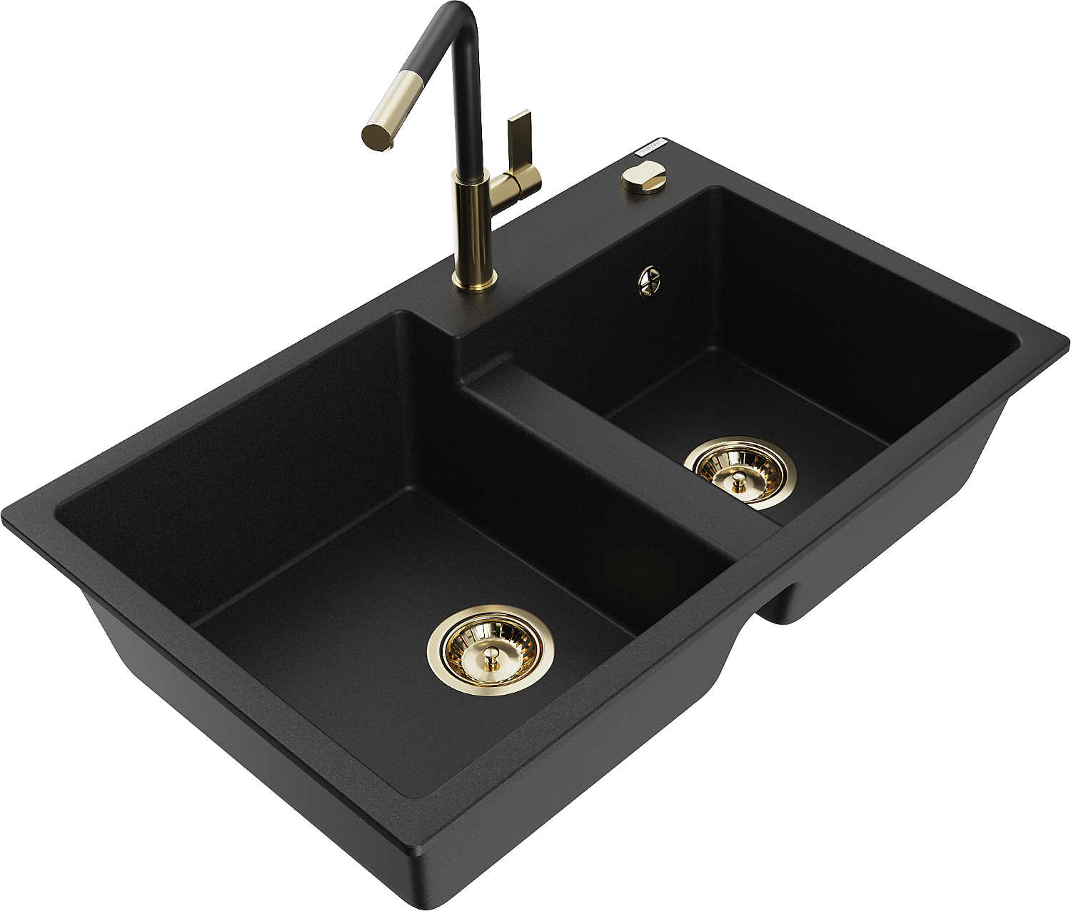 Mexen Tomas graniittinen 2-osainen keittiöallas ja Flora-keittiöhana, musta - 6516-77-670401-57-G