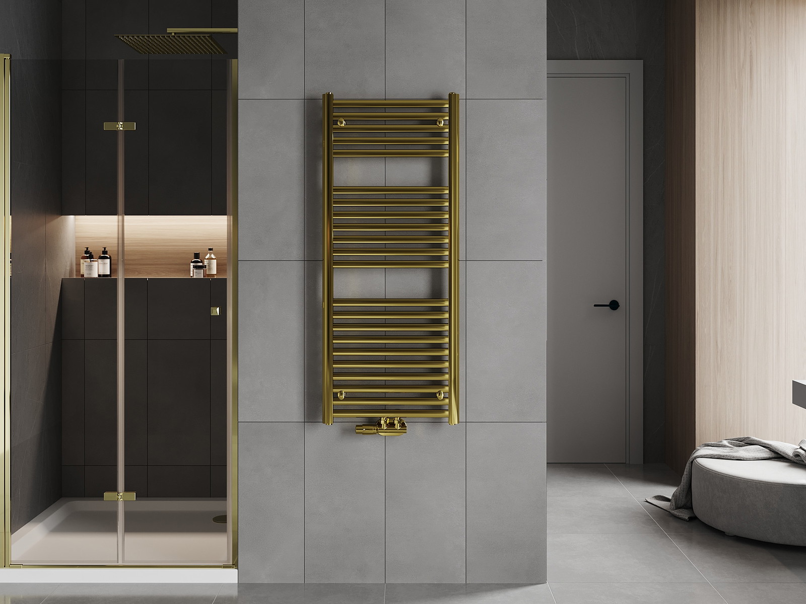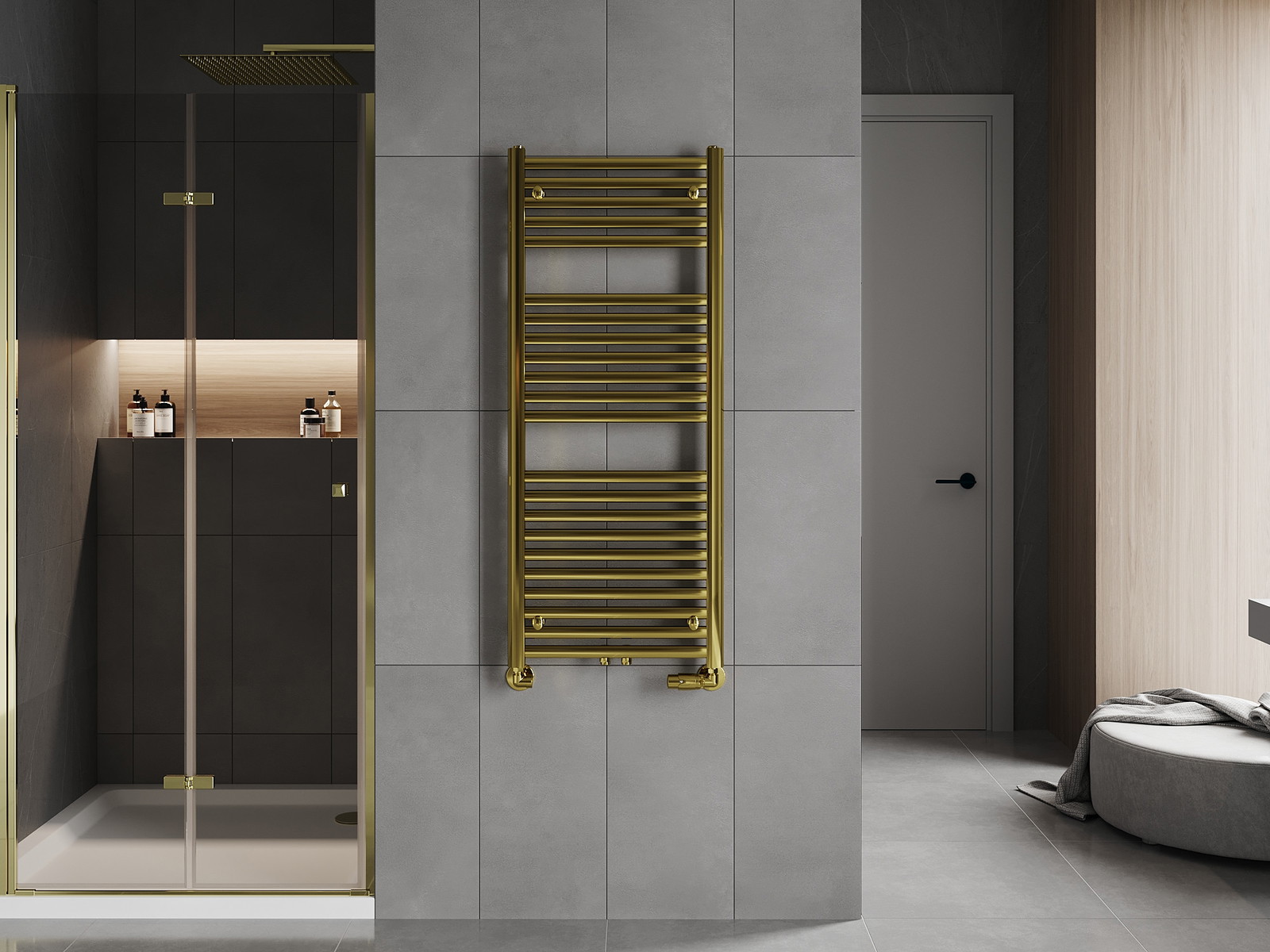 Mexen Hades on tyylikäs kylpyhuoneradiaattori kultaisessa värissä, joka sopii täydellisesti moderneihin sisätiloihin. Koko 1200 x 500 mm ja teho 450 W lämmittää huoneen erinomaisesti. Tämä kestävä teräsrakenteinen radiaattori on korroosionkestävä, kiitos kestävän maalipinnoituksen. Radiaattorin paino on 9,30 kg ja sen maksimikäyttölämpötila on 95 °C. Se mahdollistaa erilaiset liitäntävaihtoehdot ja lämmittimen asennuksen. Täydellinen paketti sisältää kiinnityselementit ja ilmanpoistajan.