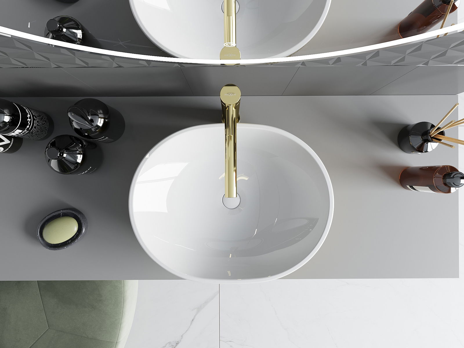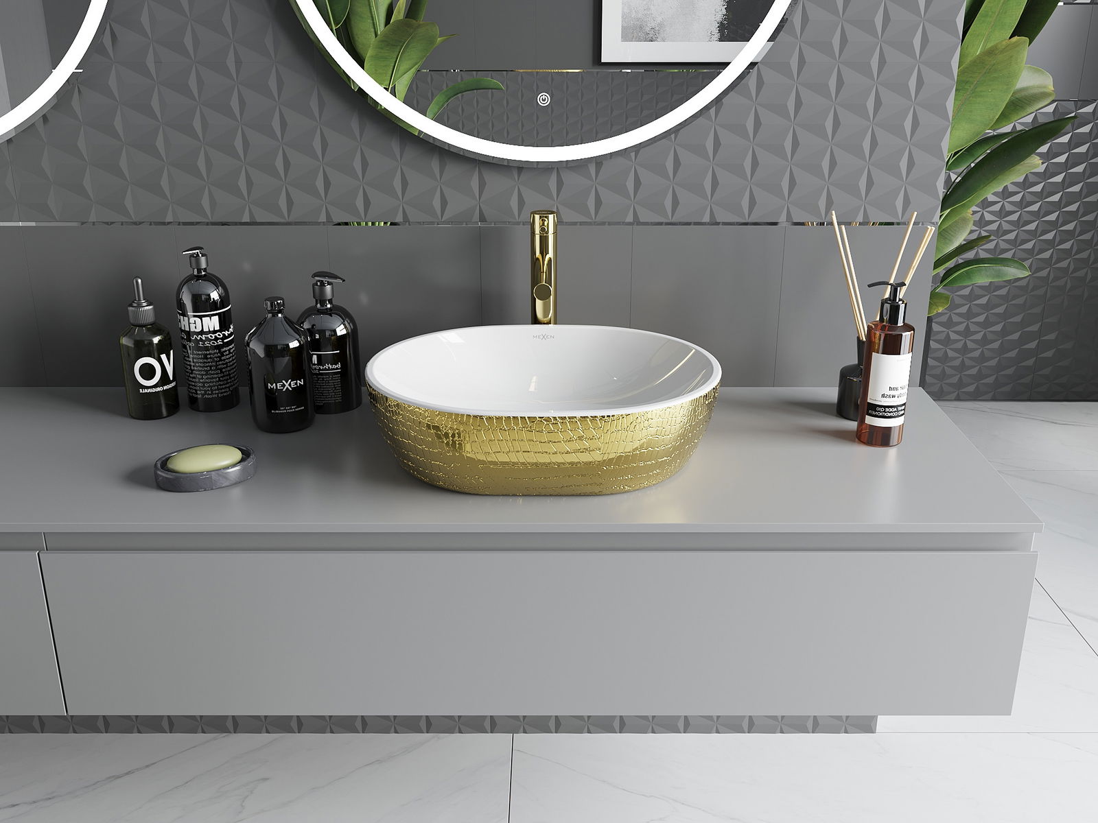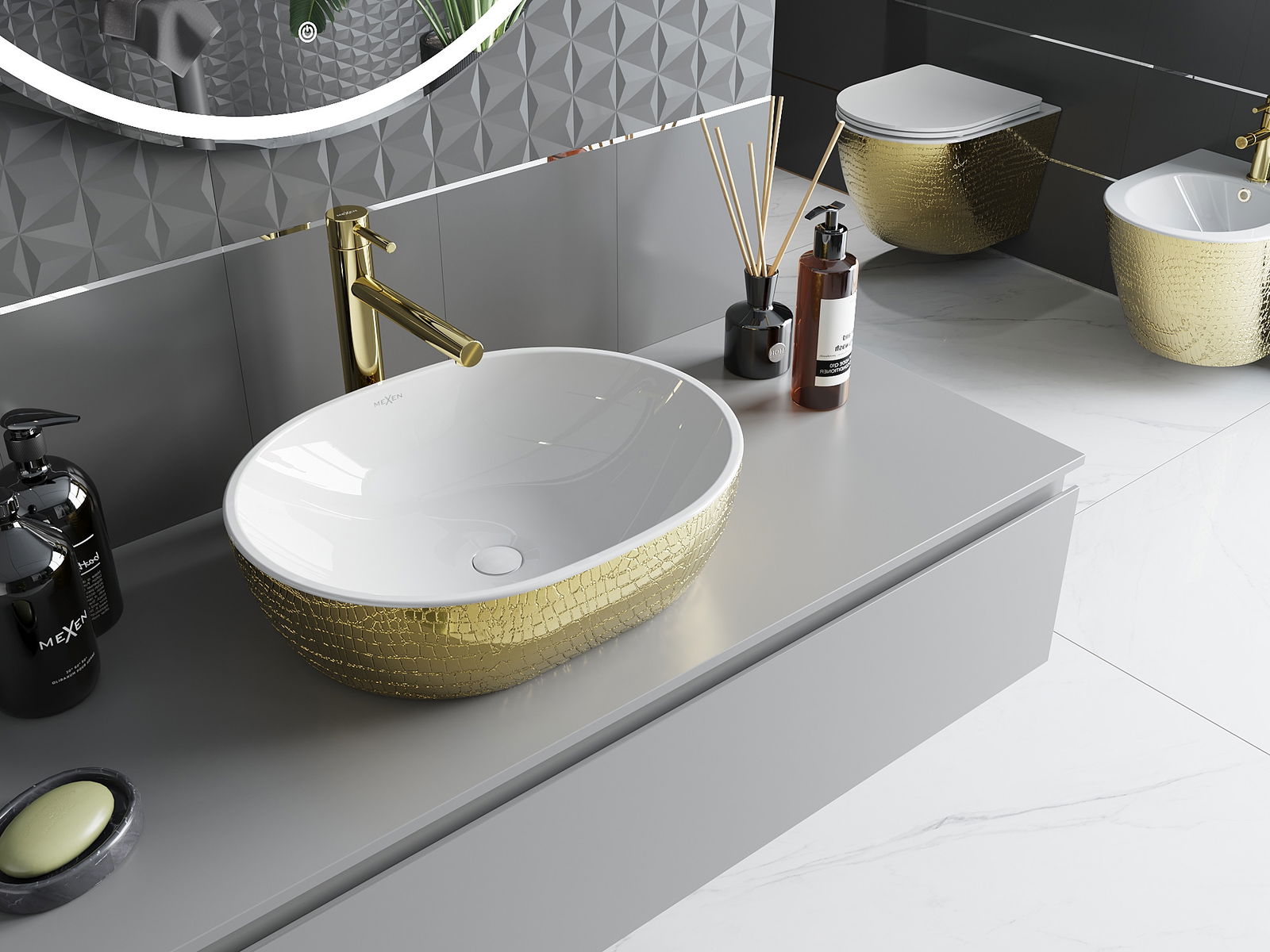 Mexen Viki on työtason pesuallas, jonka mitat ovat 48 x 35 cm ja joka yhdistää valkoisuuden ja kullan eleganssin ainutlaatuisessa suomukuviossa. Se on valmistettu saniteettikeramiikasta, mikä takaa kestävyyden ja helppouden puhtaanapidossa. Ylivuotoreiän ja hanareiän puute tekee siitä täydellisen moderniin ja minimalistiseen sisustukseen. Suojaava pinnoite, kiilto ja soikea muoto ovat tämän pesualtaan lisäetuja, ja se varmasti kaunistaa jokaista kylpyhuonetta.