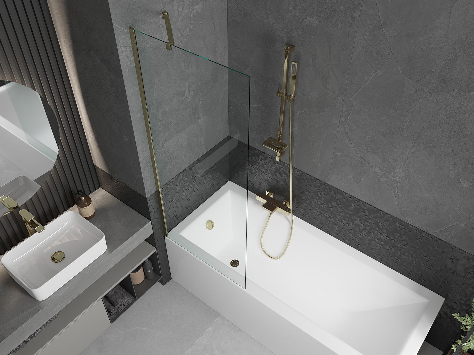 Mexen Cubik Suorakulmainen kylpyamme 150 x 70 cm kotelolla ja yksisiipisellä suihkuseinällä 70 cm, läpinäkyvä, kultainen