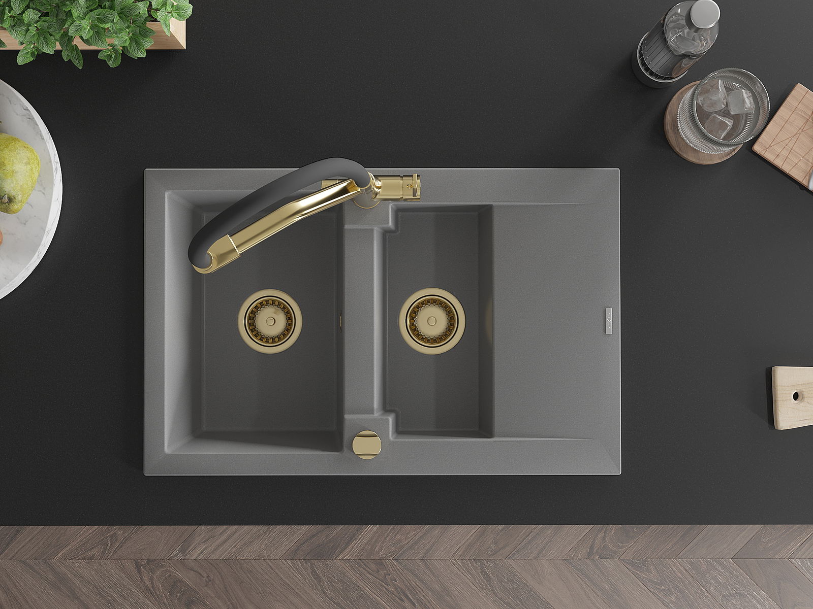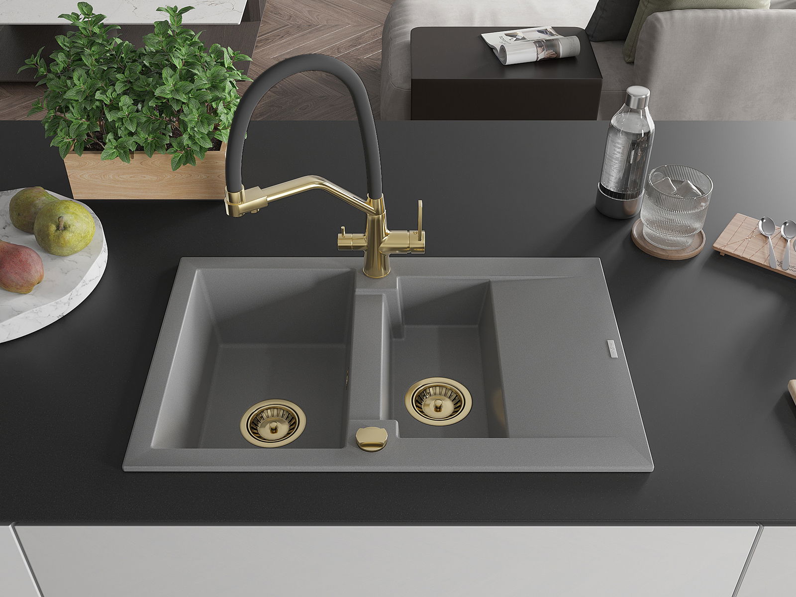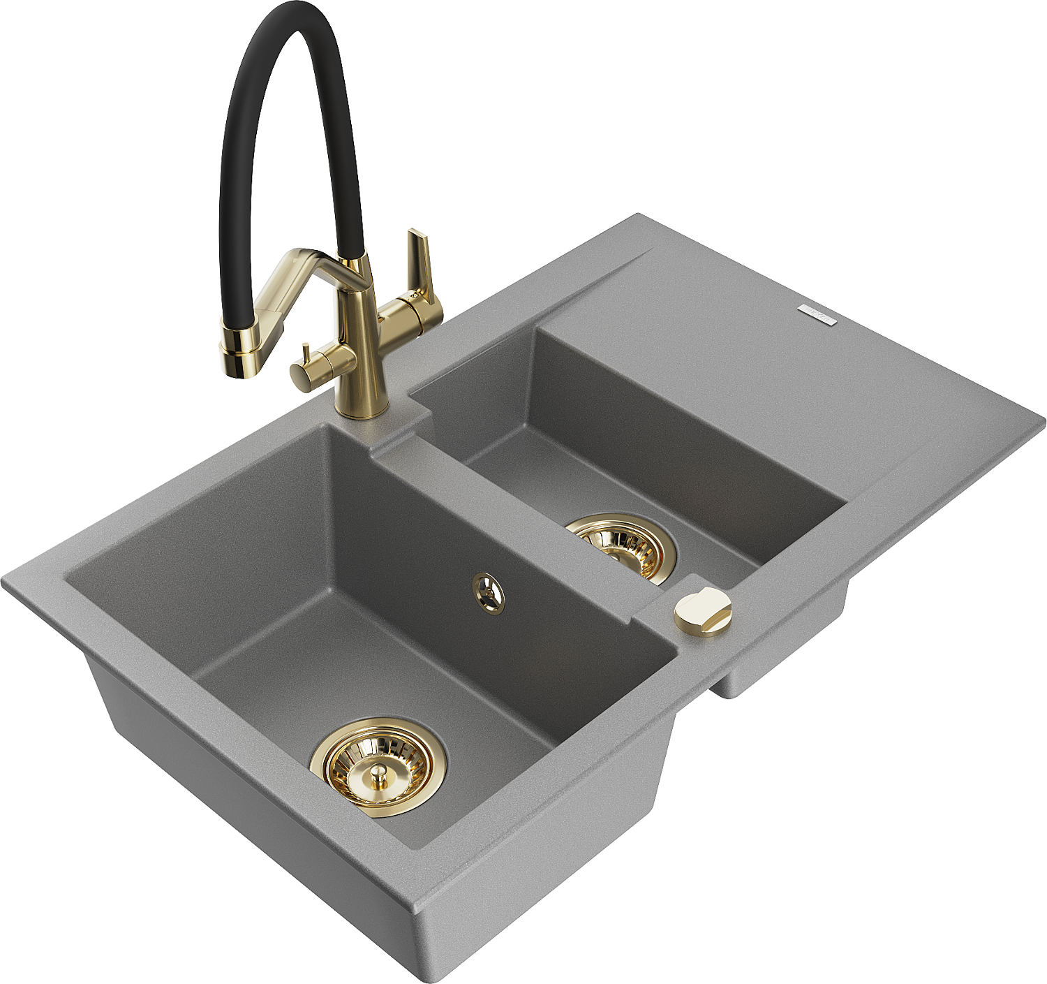 Mexen Gaspar 1,5-osainen kivikomposiittiallas valutustasolla ja keittiöhanalla Duo, harmaa - 6507-71-671701-57-G