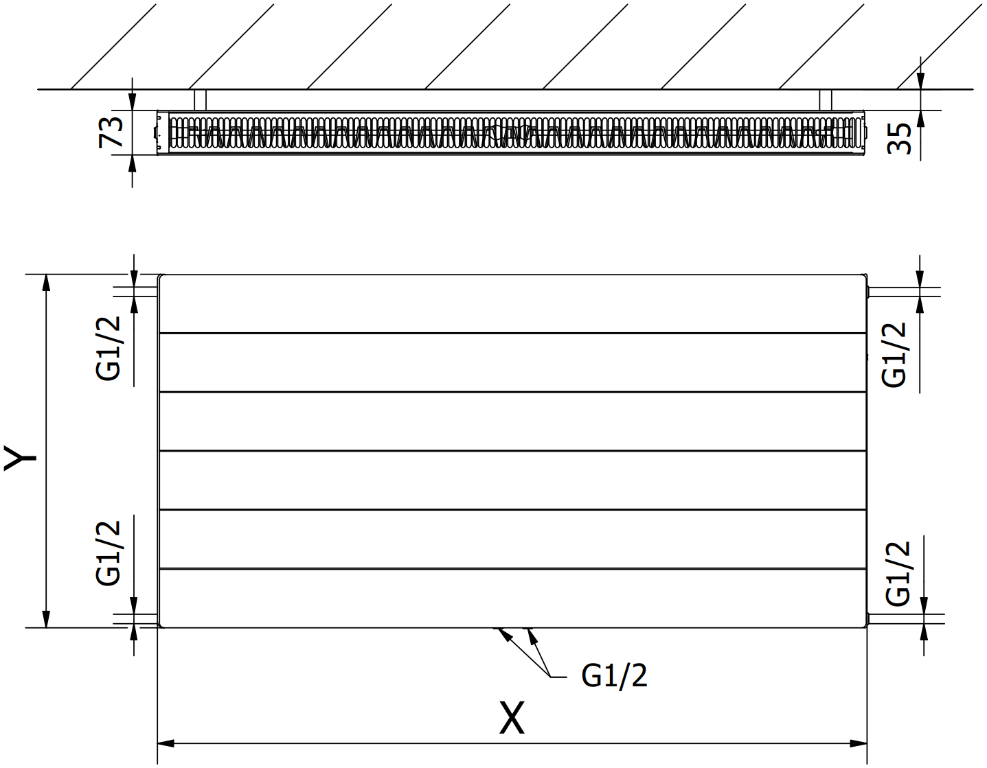 Kuvat esittävät jäähdytintä, jonka koko on 600 x 1200 mm.