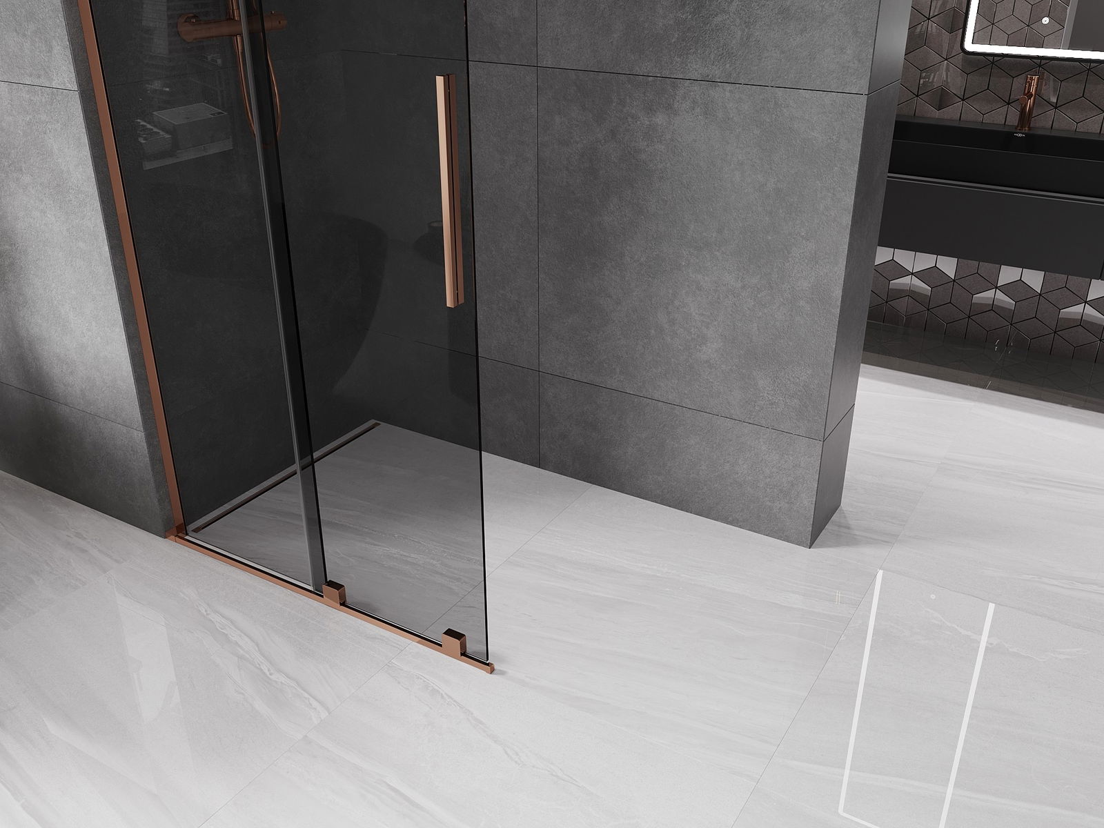 Mexen Velar L Liukuva Walk-in suihkuseinä 100 x 200 cm, grafiitti 8 mm, ruusukulta - 871-100-003-43-60