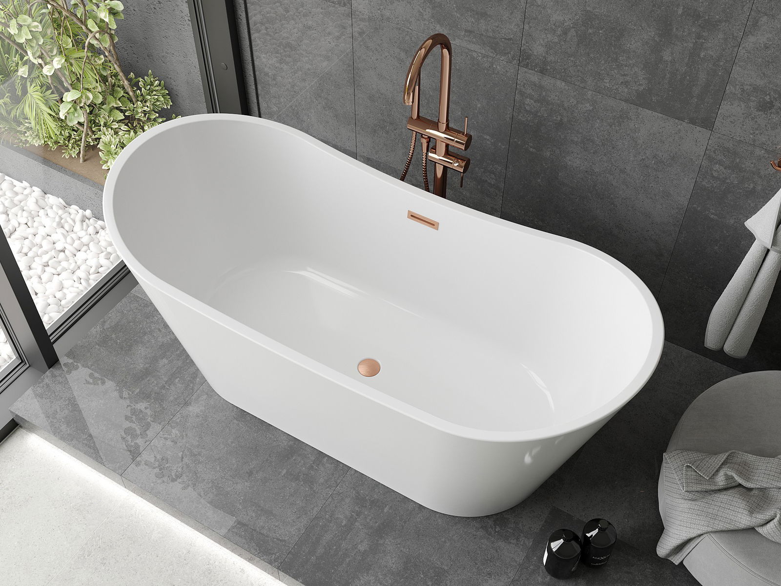 Vapaasti seisova kylpyamme kutsuu rentoutumaan ylellisessä ympäristössä. Se on elegantin soikion muotoinen ja valmistettu kestävästä saniteettiakryylistä, mikä takaa sen pitkäikäisyyden ja helppohoitoisuuden. Mitat 180 x 80 cm ja korkeus 72 cm tekevät siitä täydellisen lisän jokaiseen kylpyhuoneeseen. Tyylikäs valkoinen viimeistely harjatuilla kupariyksityiskohdilla ja keskellä oleva viemäriaukko korostavat sen nykyaikaisuutta. Sisältää ylijuoksun ja viemärin, jotka takaavat käyttömukavuuden.