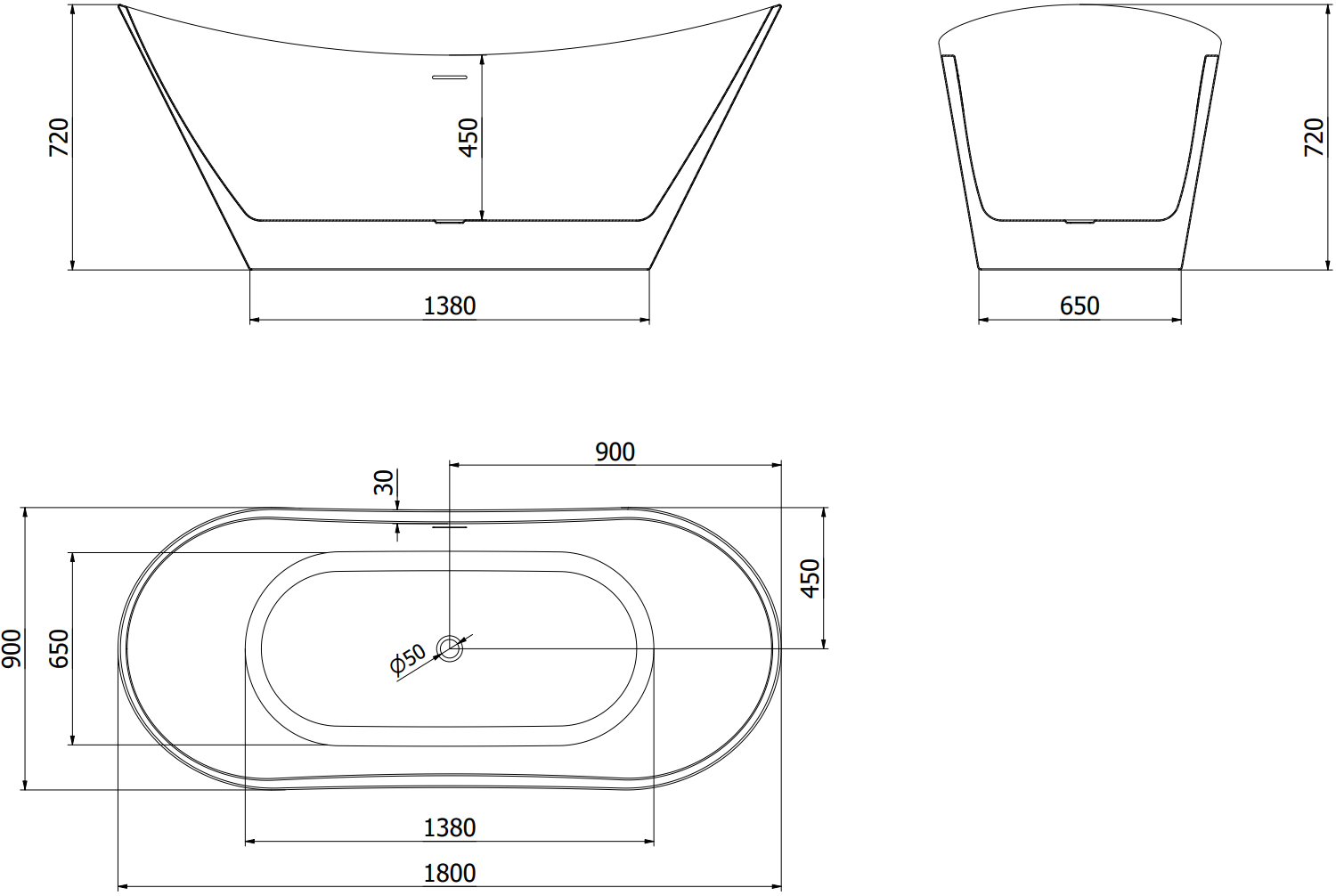 Mexen Montana Vapaasti seisova kylpyamme 180 x 90 cm, valkoinen/musta, ylivuoto gun metal - 52011809075-95