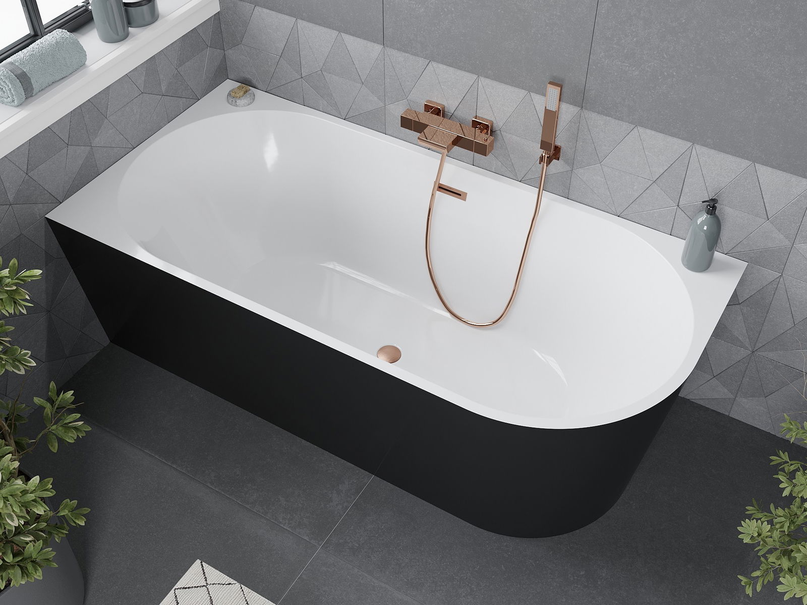 Mexen Mia vapaa seisova kulmainen kylpyamme vasen 170 x 80 cm, valkoinen/musta, harjattu kupari - 52691708075L-65