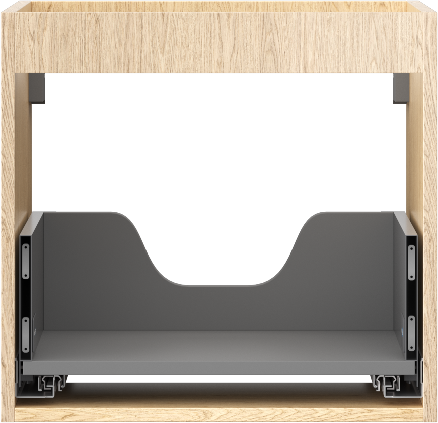 Laatikon leikkaus on suunniteltu siten, että se mahtuu vetolaitteeseen, joka on välttämätön pesuallasasennuksissa. Tämän ansiosta huonekalu voidaan asentaa täysin toimivasti, luopumatta laatikon tilasta asennusten hyväksi.