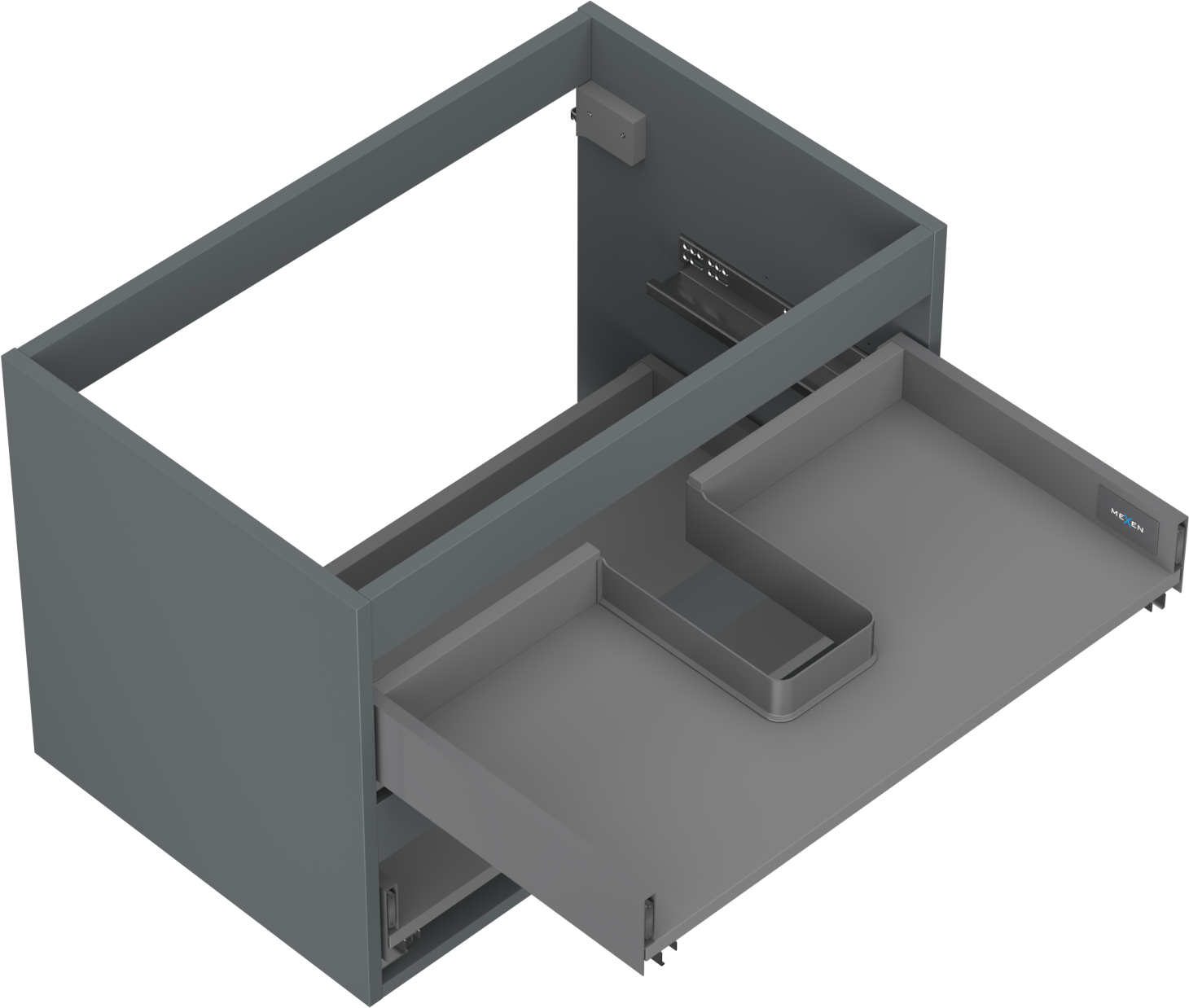 Laatikon leikkaus on suunniteltu siten, että se mahtuu vetolaitteeseen, joka on välttämätön pesuallasasennuksissa. Tämän ansiosta huonekalu voidaan asentaa täysin toimivasti, luopumatta laatikon tilasta asennusten hyväksi.