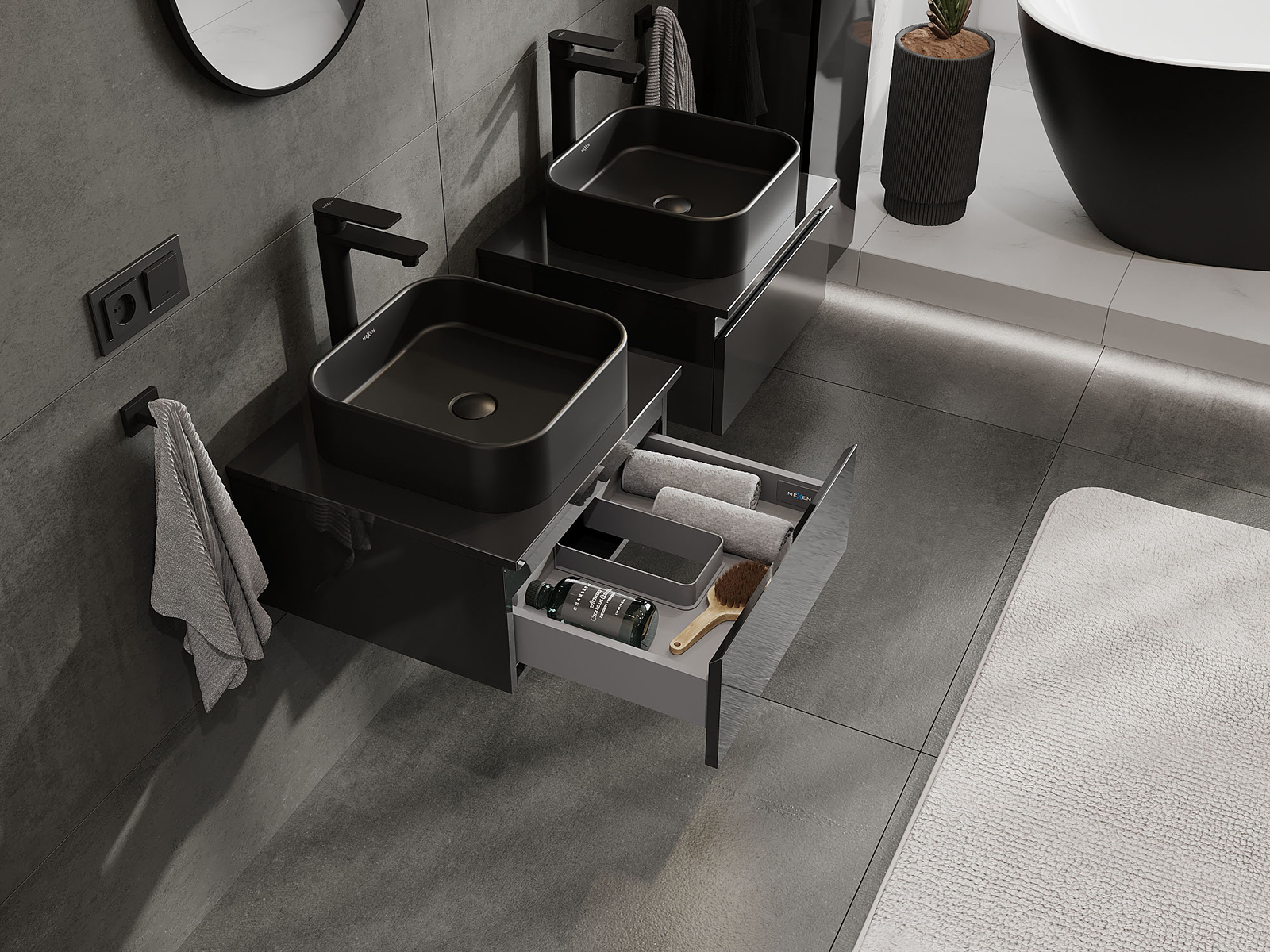 Mexen Orio kylpyhuonekaappi pesualtaan alle 50 cm, 1 laatikko, musta kiiltävä - 91A10-05023-1-BF70
