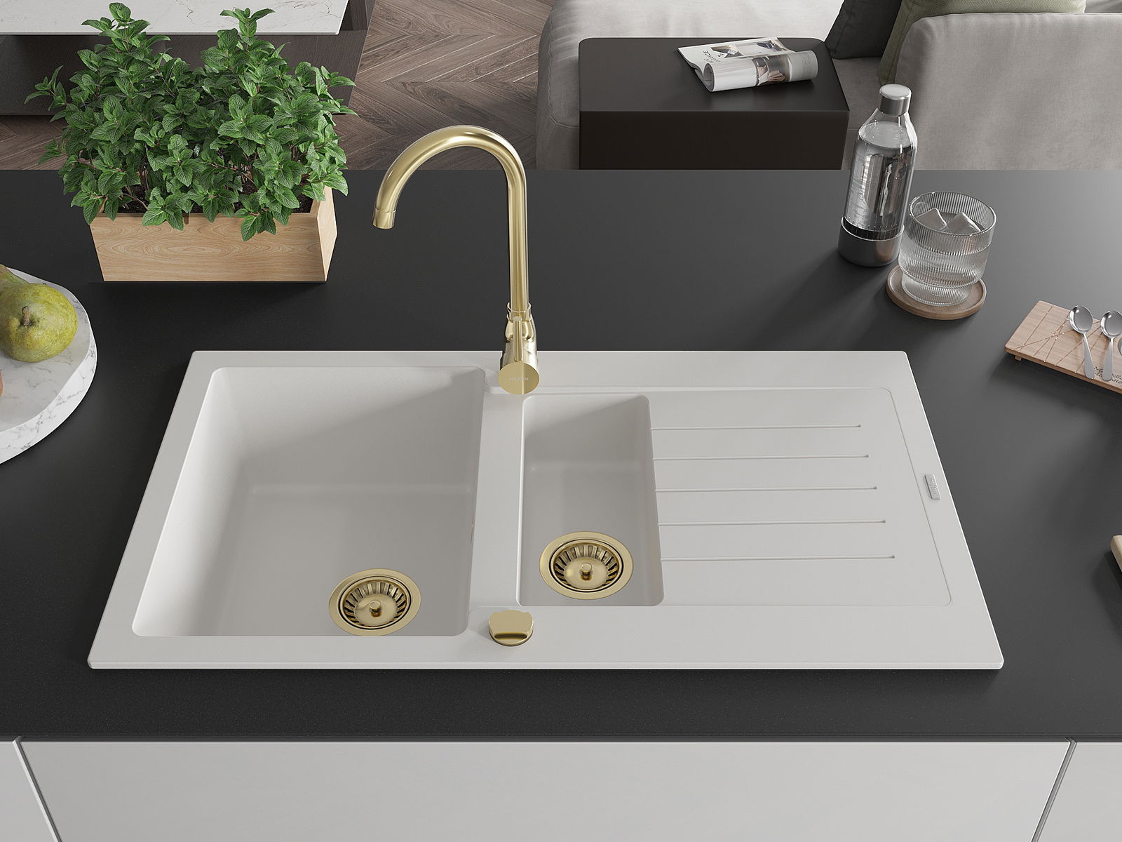 Mexen Matias graniittinen 1,5-kammioinen tiskiallas valutuspinnalla ja keittiöhanalla Telma, valkoinen - 6502-20-670200-50