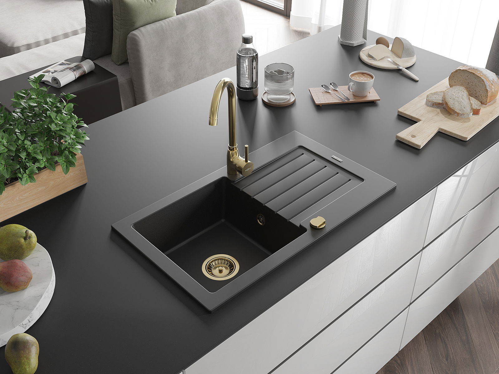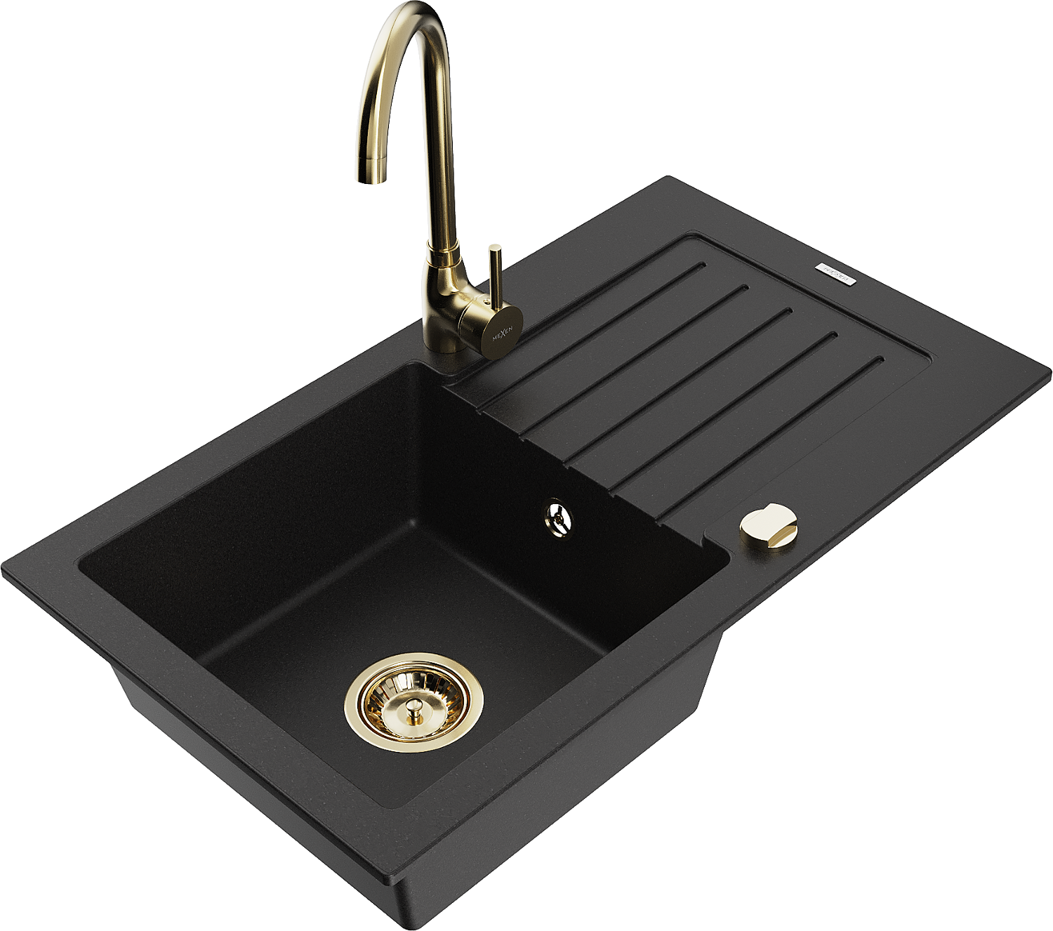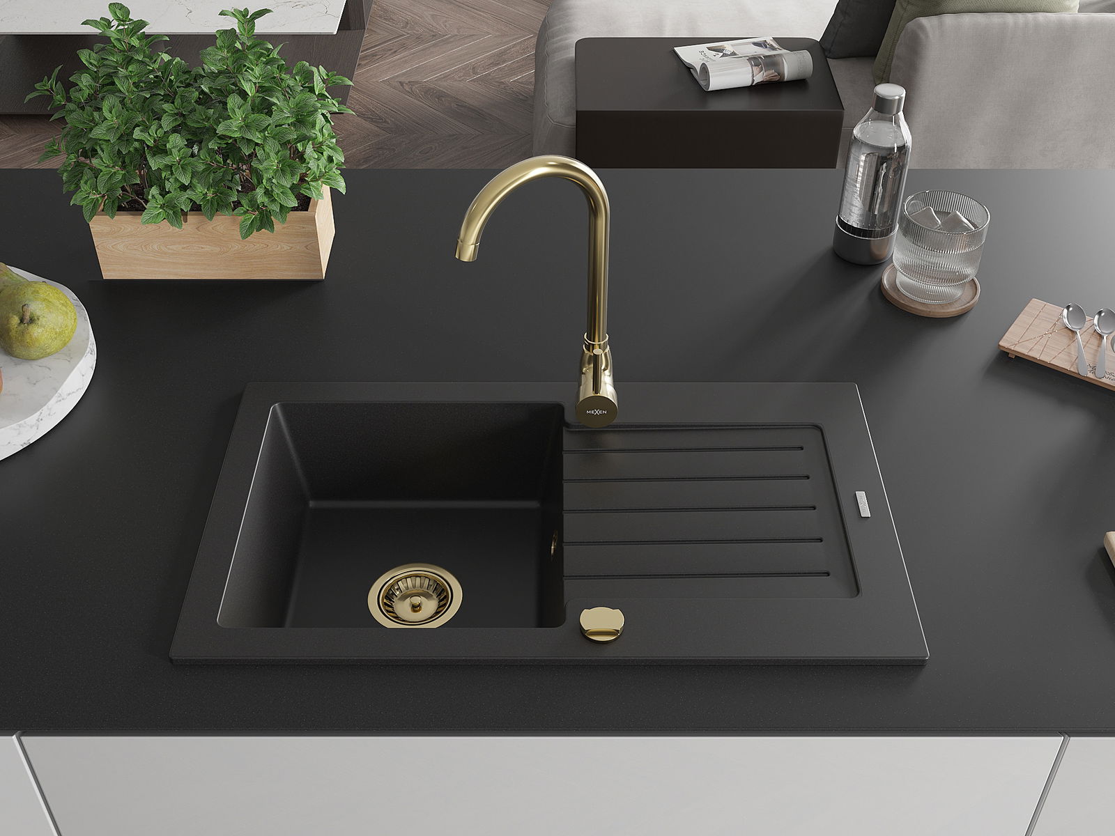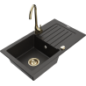 Mexen Pablo 1-osainen graniittinen pesuallas valutustasolla ja keittiöhanalla Telma, musta - 6510-77-670200-50