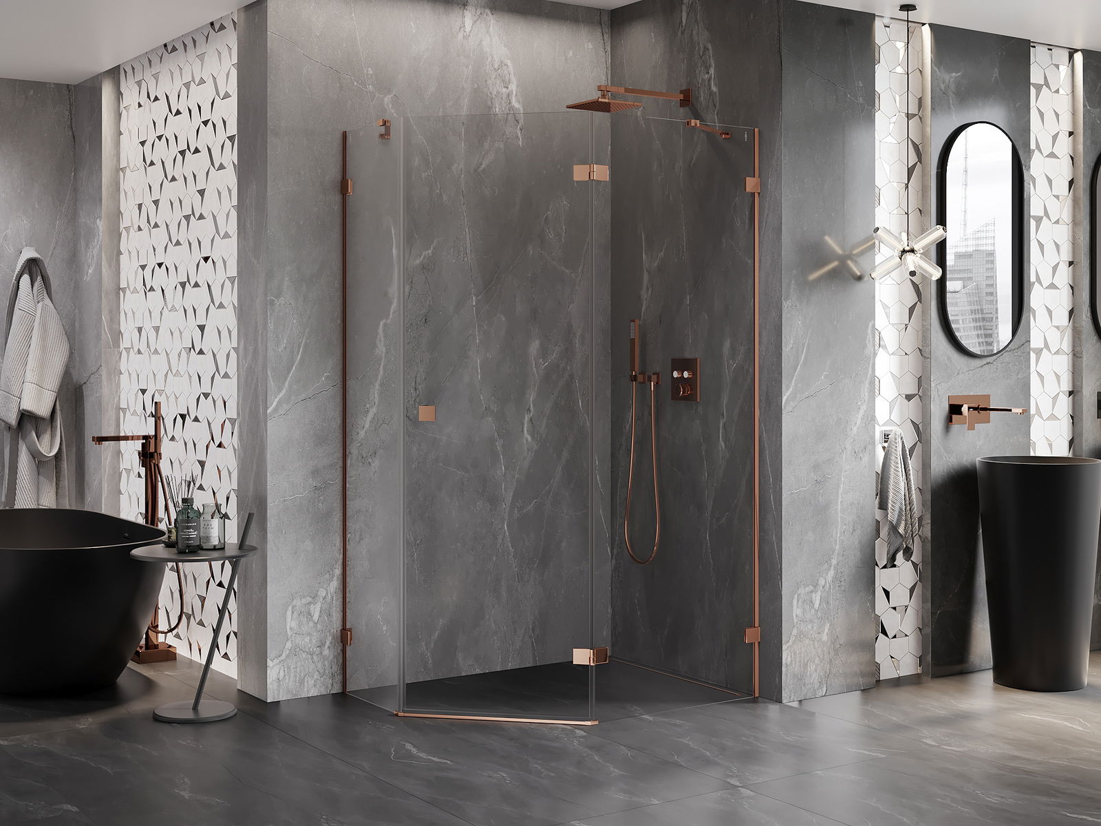 Mexen Lunar viisikulmainen suihkukoppi oikea avautuva 90 x 80 cm, läpinäkyvä, ruusukulta - 831-090P-080L-60-00-P