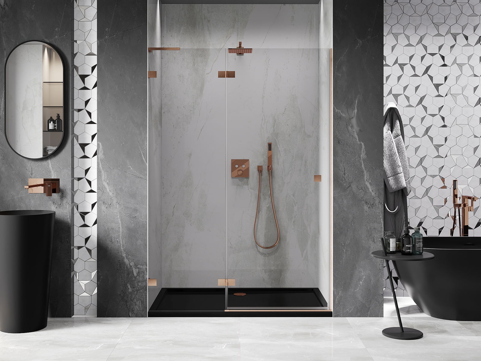Pidikkeet ja saranat on valmistettu erittäin kestävästä messingistä, ja ne muodostavat lisäksilinjassa olevan lasilevyn. Tämä on erinomainen valinta, joka yhdistää eleganssin, kestävyyden ja modernin muotoilun. Tällaisilla ratkaisuilla suihku parantaa esteettisyyttä, ja samalla helpottavat puhtauden ylläpitämistä.