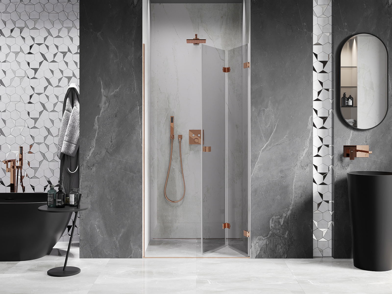 Mexen Lunar-F oikeanpuoleinen taitettava suihkuovi 75 cm, läpinäkyvä, harjattu kupari - 836-075-000-65-00-P