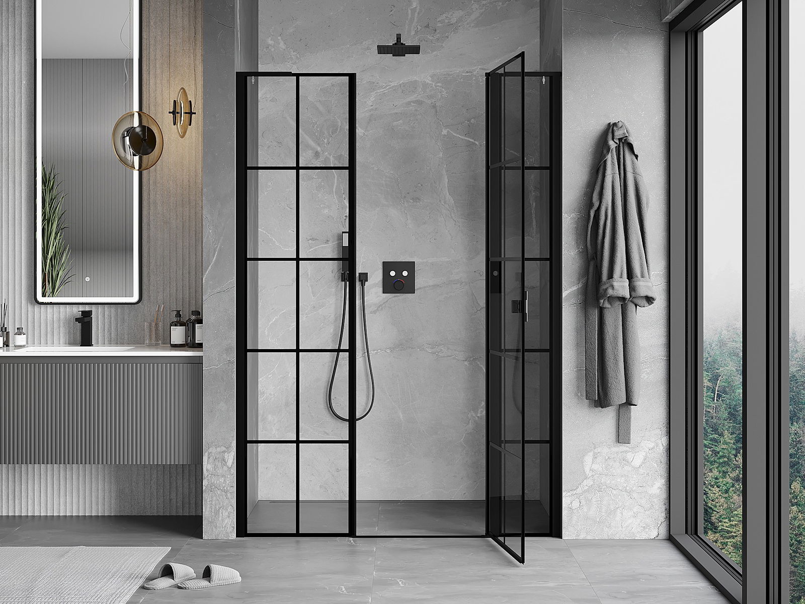 Mexen Mist L oikeanpuoleinen 155 cm kääntyvä suihkuovi, musta ruudukko, musta - 8A4L-155-001-70-77-P