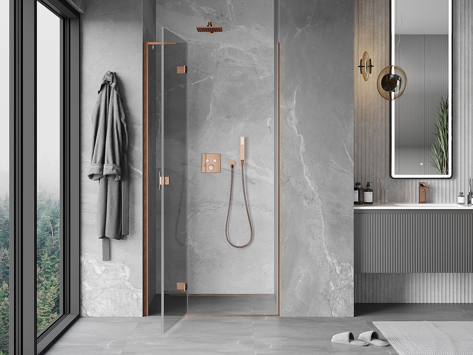 Mexen Mist-H L vasen saranoitu suihkuovi 115 cm, läpinäkyvä, harjattu kupari - 8A5L-115-000-65-00-L
