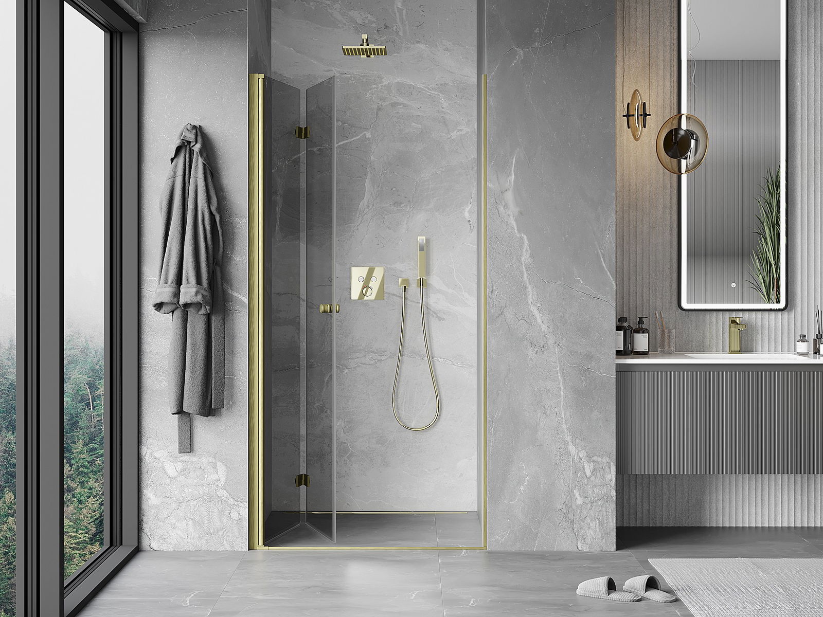 Mexen Mist-F kokoontaitettava suihkuovi vasen 110 cm, läpinäkyvä, harjattu kulta - 8A6-110-000-55-00-L