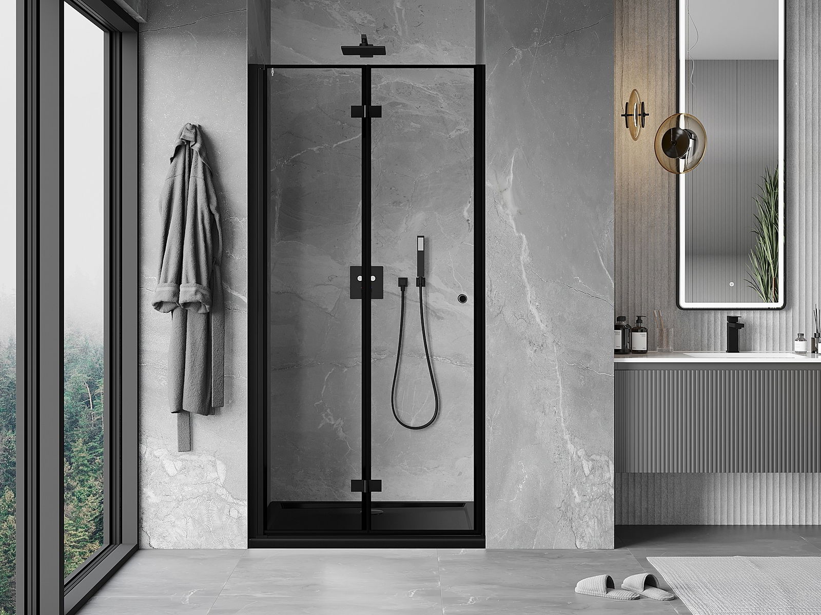 Mexen Mist-F vasen taitettava suihkuovi 85 cm, musta kehys, musta - 8A6-085-000-70-70-L