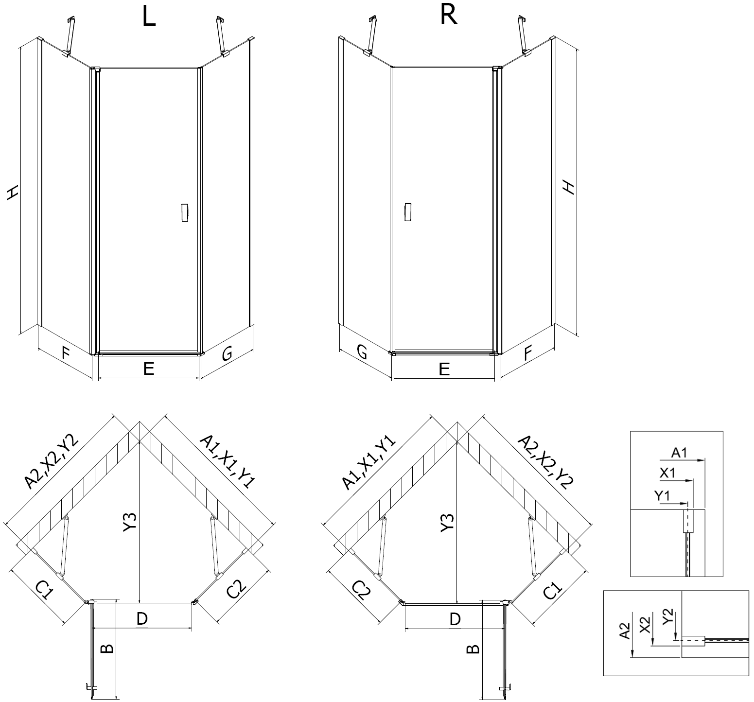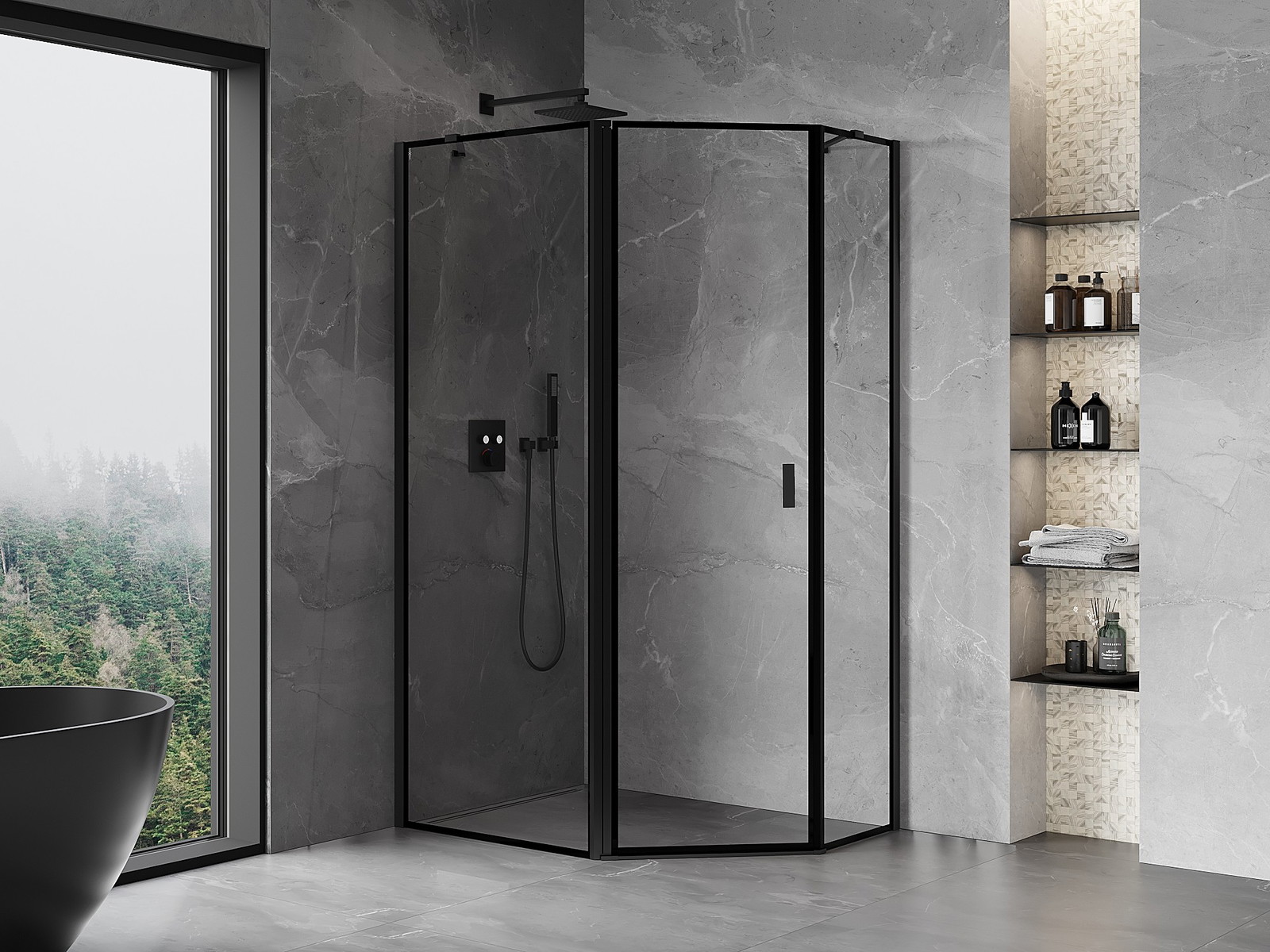 Mexen Mist epäsymmetrinen viisisivuinen suihkukaappi, avattava ovi vasen 90 x 80 cm, musta kehys, musta - 8A8-090-080-70-70-L