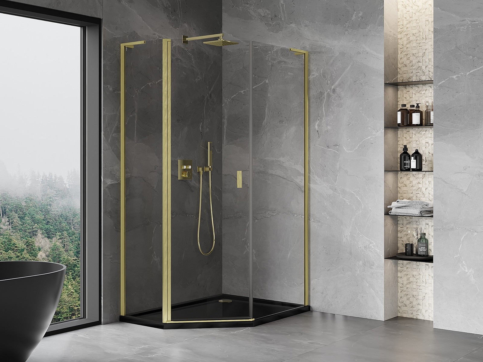 Mexen Mist L epäsymmetrinen käännettävä viisikulmainen suihkukaappi 80x100 cm, läpinäkyvä, harjattu kulta