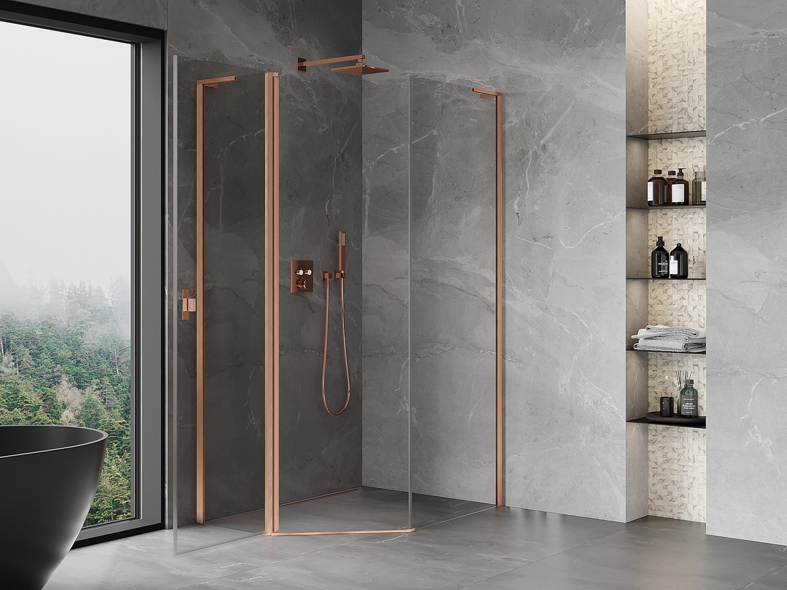Mexen Mist L epäsymmetrinen viisisivuinen suihkukaappi, kääntyvä 80x90 cm, läpinäkyvä, harjattu kupari