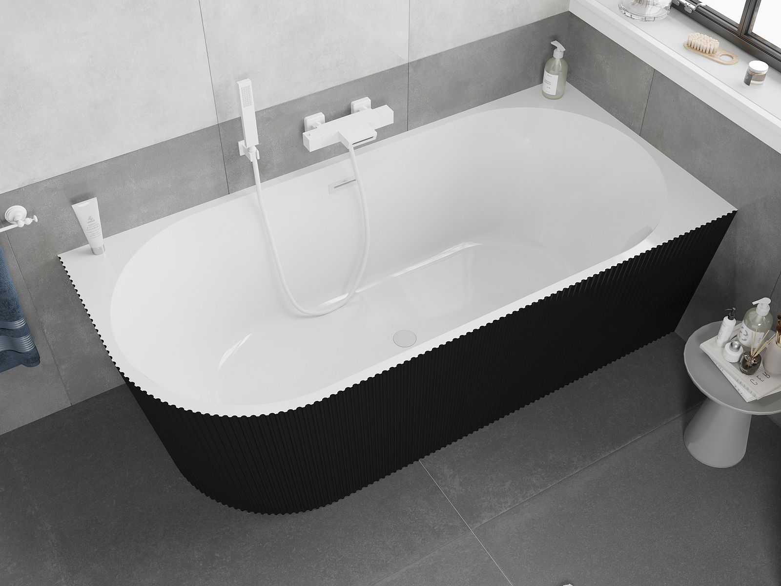 Mexen Silo vapaasti seisova kulmakylpyamme oikea, uritettu 150 x 75 cm, valkoinen/musta, valkoinen ylivuoto - 52891507575P-20