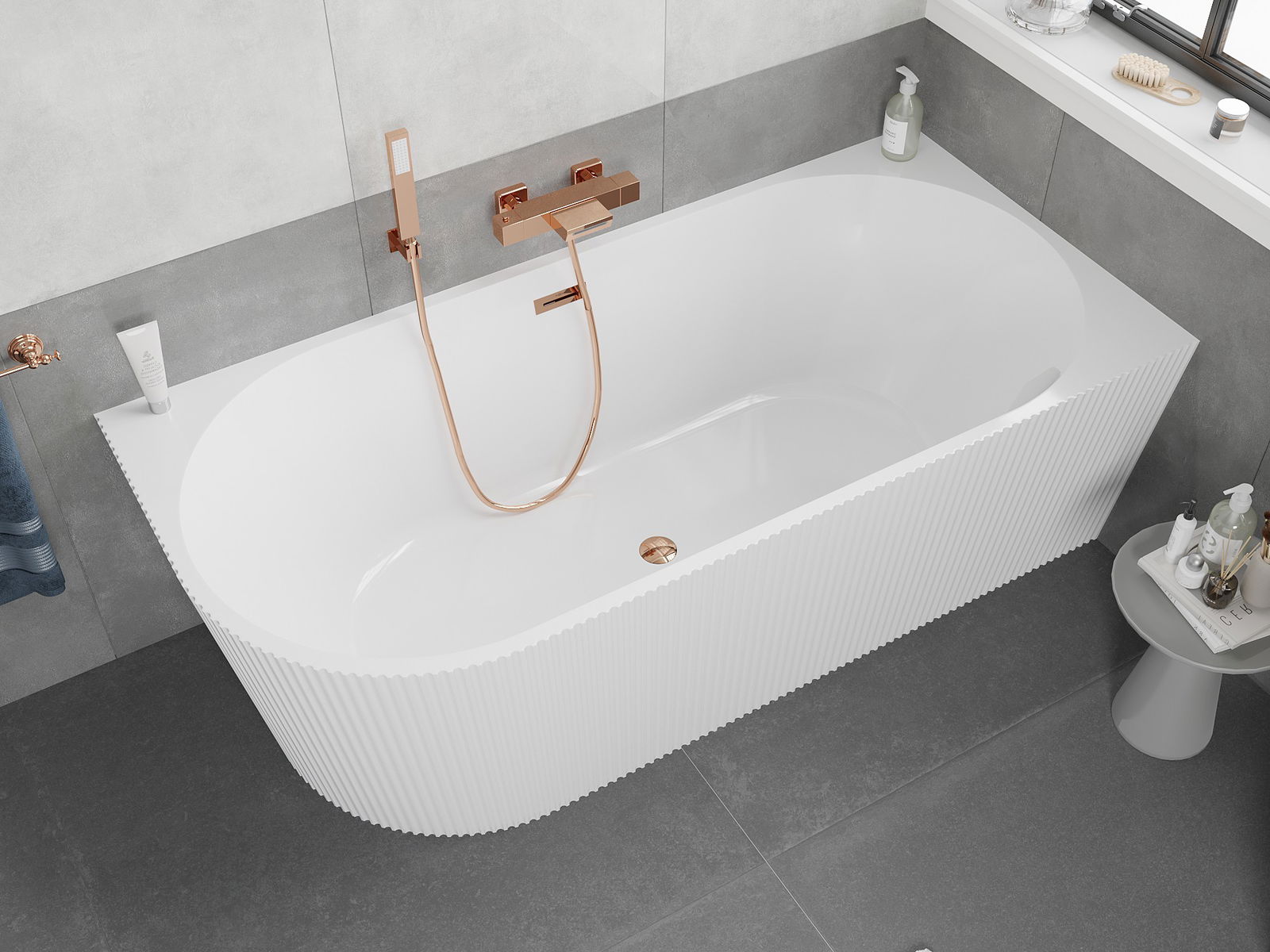 Mexen Silo vapaasti seisova kulmamallinen oikea uurrettu kylpyamme 170 x 80 cm, valkoinen, ylijuoksu ruusukulta