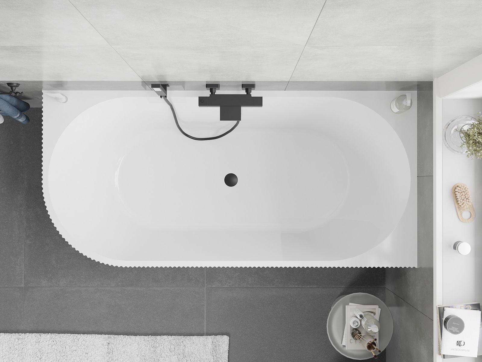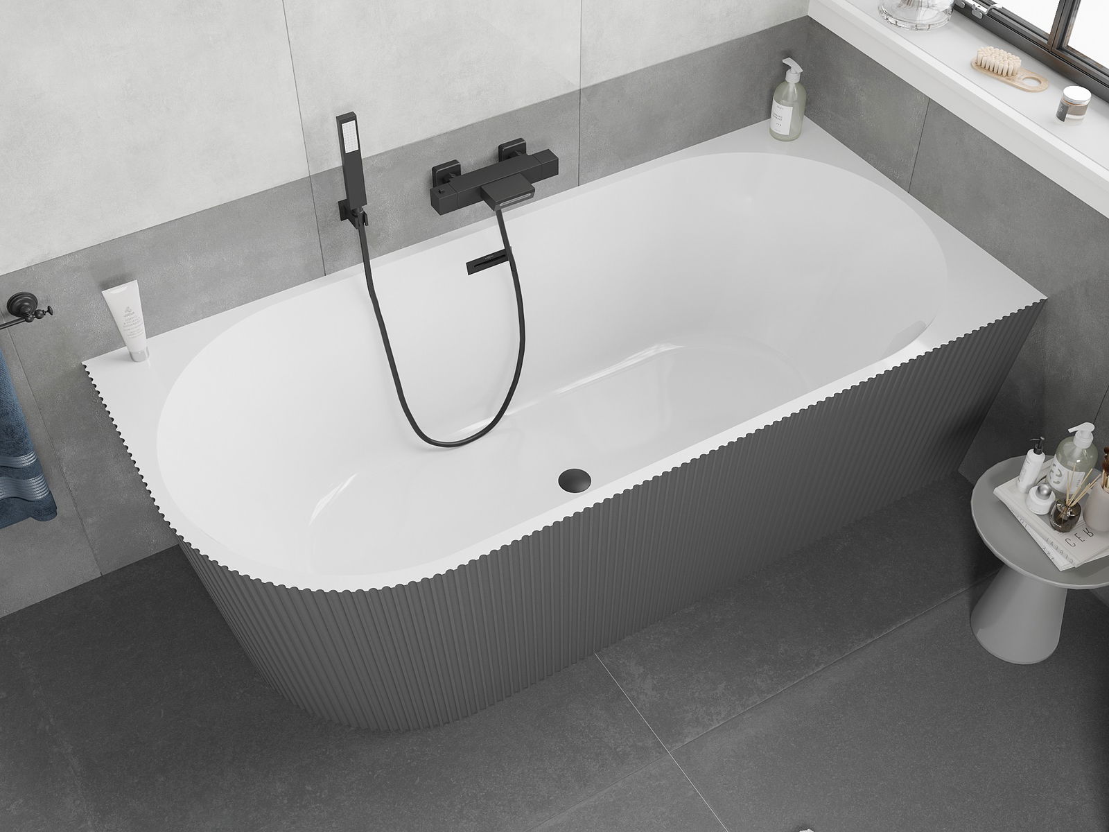 Mexen Silo vapaasti seisova kulmakylpyamme oikea uritettu 150 x 75 cm, valkoinen/harmaa, musta ylivuoto - 52891507562P-70