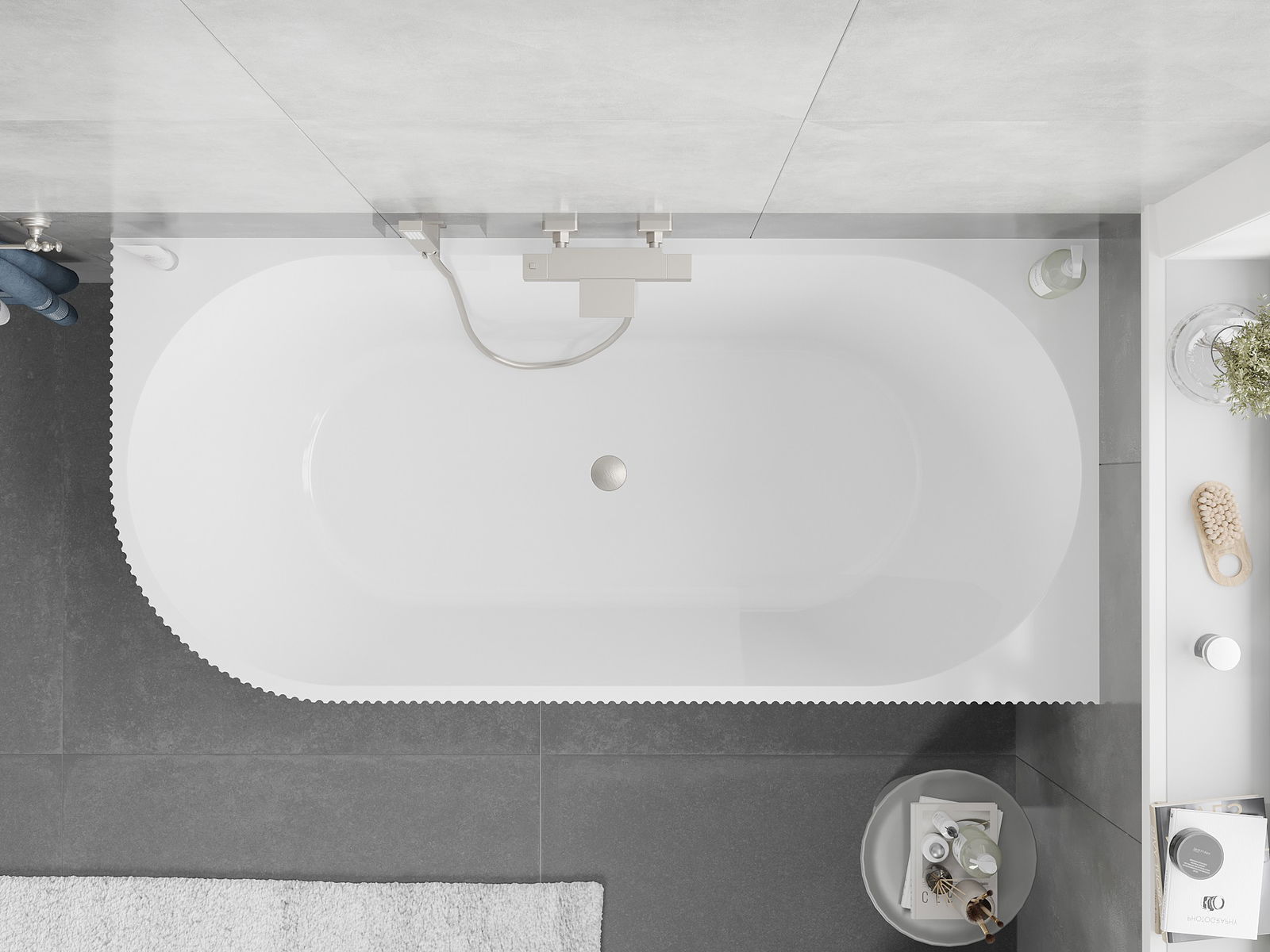 Mexen Silo vapaasti seisova viisto oikea kylpyamme uritettu 170 x 80 cm, valkoinen/harmaa, harjattu nikkeliylivuoto