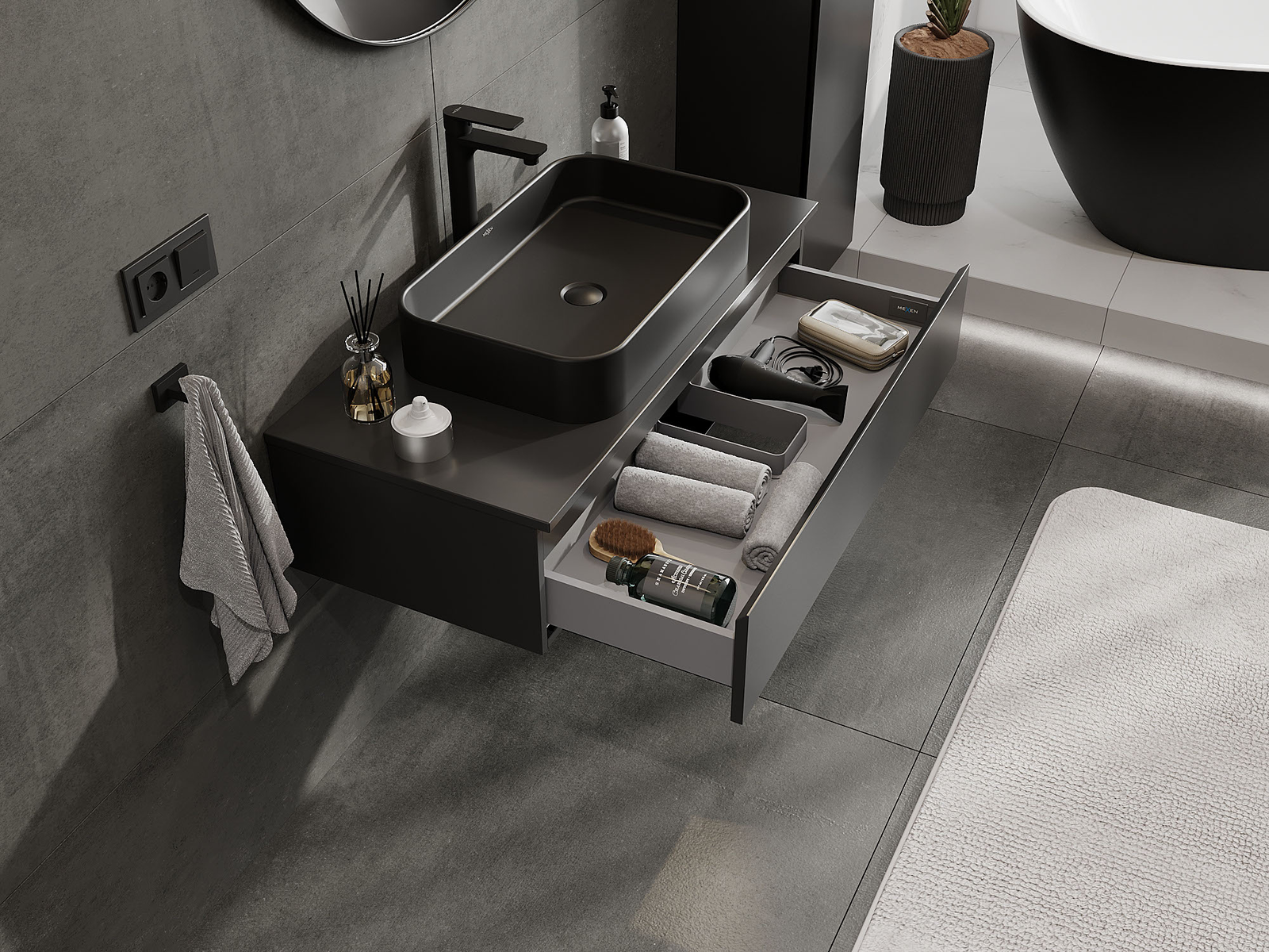 Mexen Orio 100 cm leveä kylpyhuoneen allaskaappi, 1 laatikko, musta matta - 91A10-10023-1-BF71