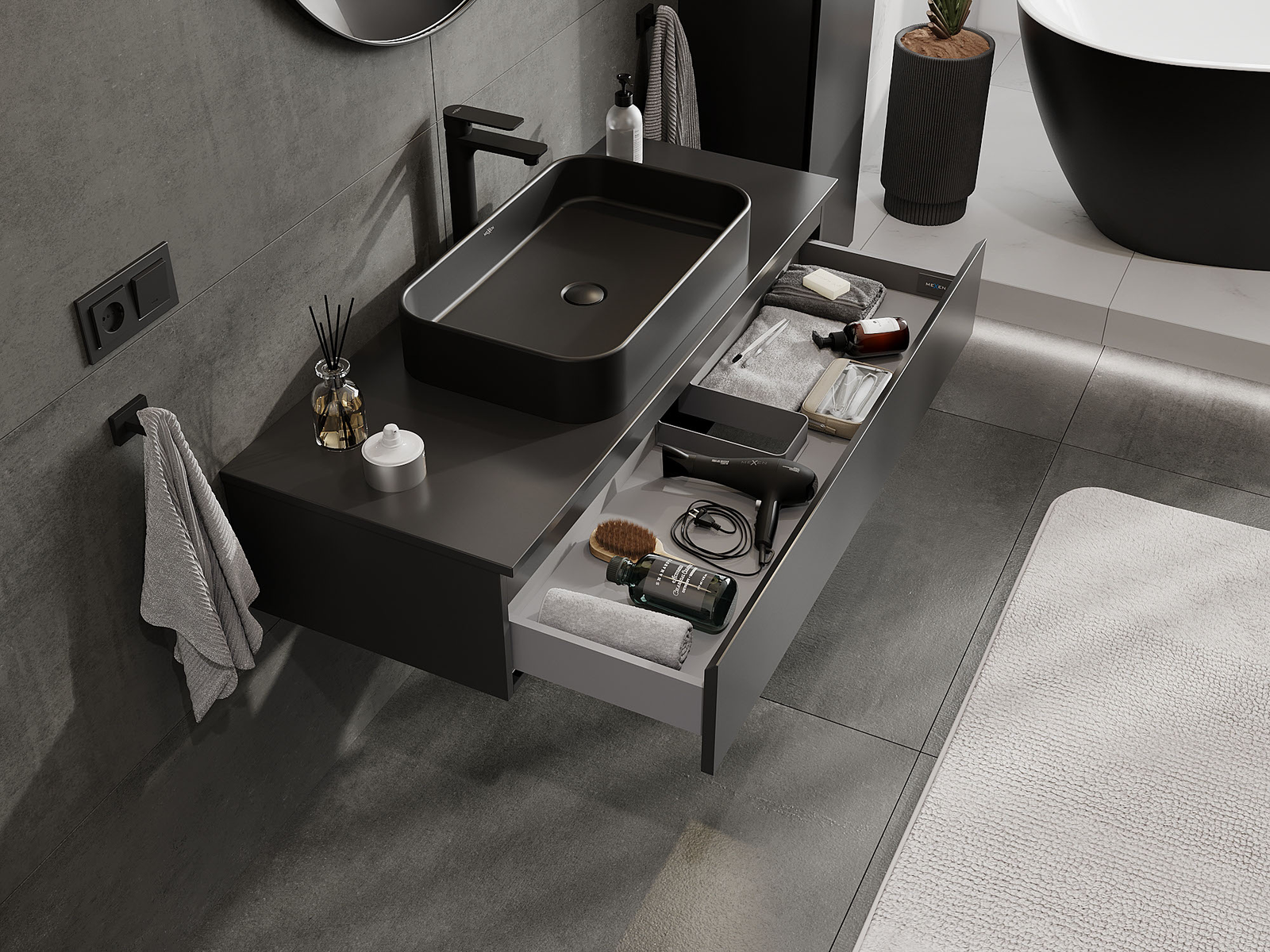 Mexen Orio 120 cm leveä kylpyhuoneen allaskaappi, 1 laatikko, musta matta - 91A10-12023-1-BF71