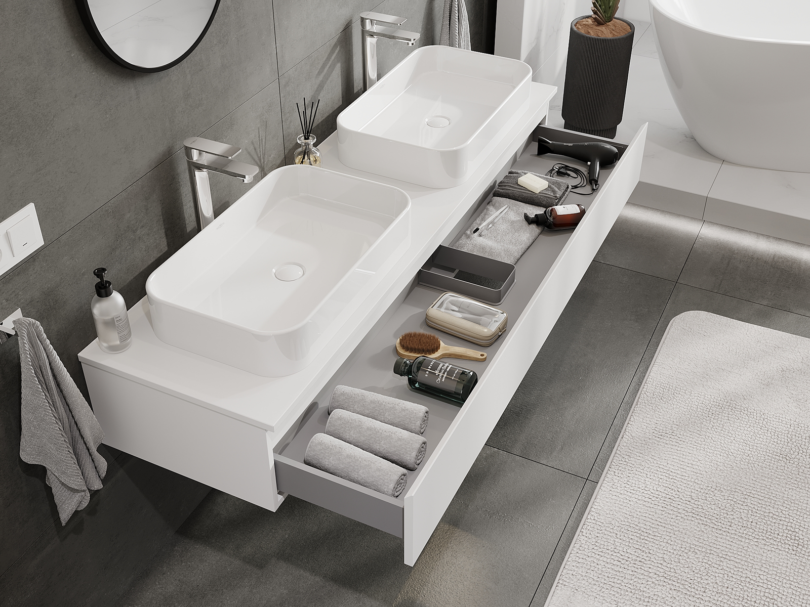 Modulaariset kylpyhuonekalusteemme voidaan yhdistää eri väriyhdistelminä, mikä mahdollistaa täydellisen personoinnin. Voit valita sekä ulkonäön että yksittäisten elementtien toiminnot, mikä mahdollistaa huonekalujen mukauttamisen omien tyylillisten ja käyttöön liittyvien mieltymysten mukaan.