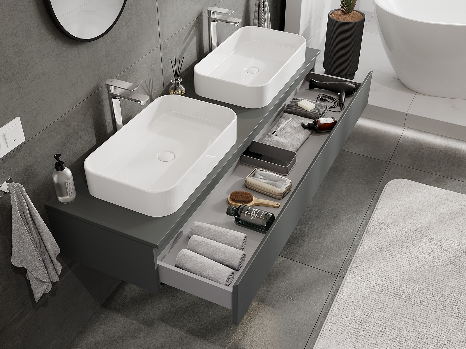 Modulaariset kylpyhuonekalusteemme voidaan yhdistää eri väriyhdistelminä, mikä mahdollistaa täydellisen personoinnin. Voit valita sekä ulkonäön että yksittäisten elementtien toiminnot, mikä mahdollistaa huonekalujen mukauttamisen omien tyylillisten ja käyttöön liittyvien mieltymysten mukaan.