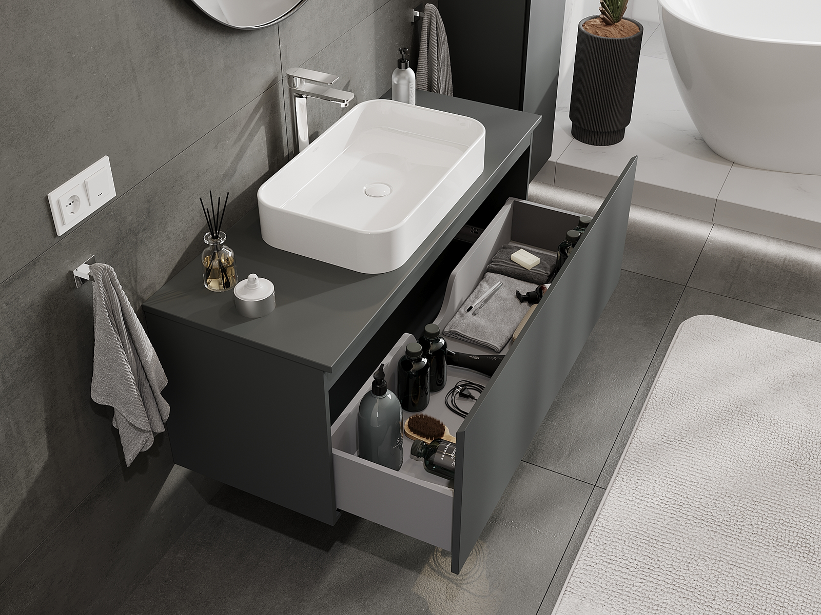 Kiinteiden materiaalien, tarkan työn ja nykyaikaisten teknologisten ratkaisujen ansiosta tuote tarjoaa käyttömukavuutta, kestävyyttä kosteutta ja lämpötilan muutoksia vastaan sekä elegantin ulkonäön, joka sopii erilaisiin kylpyhuonetyyleihin.