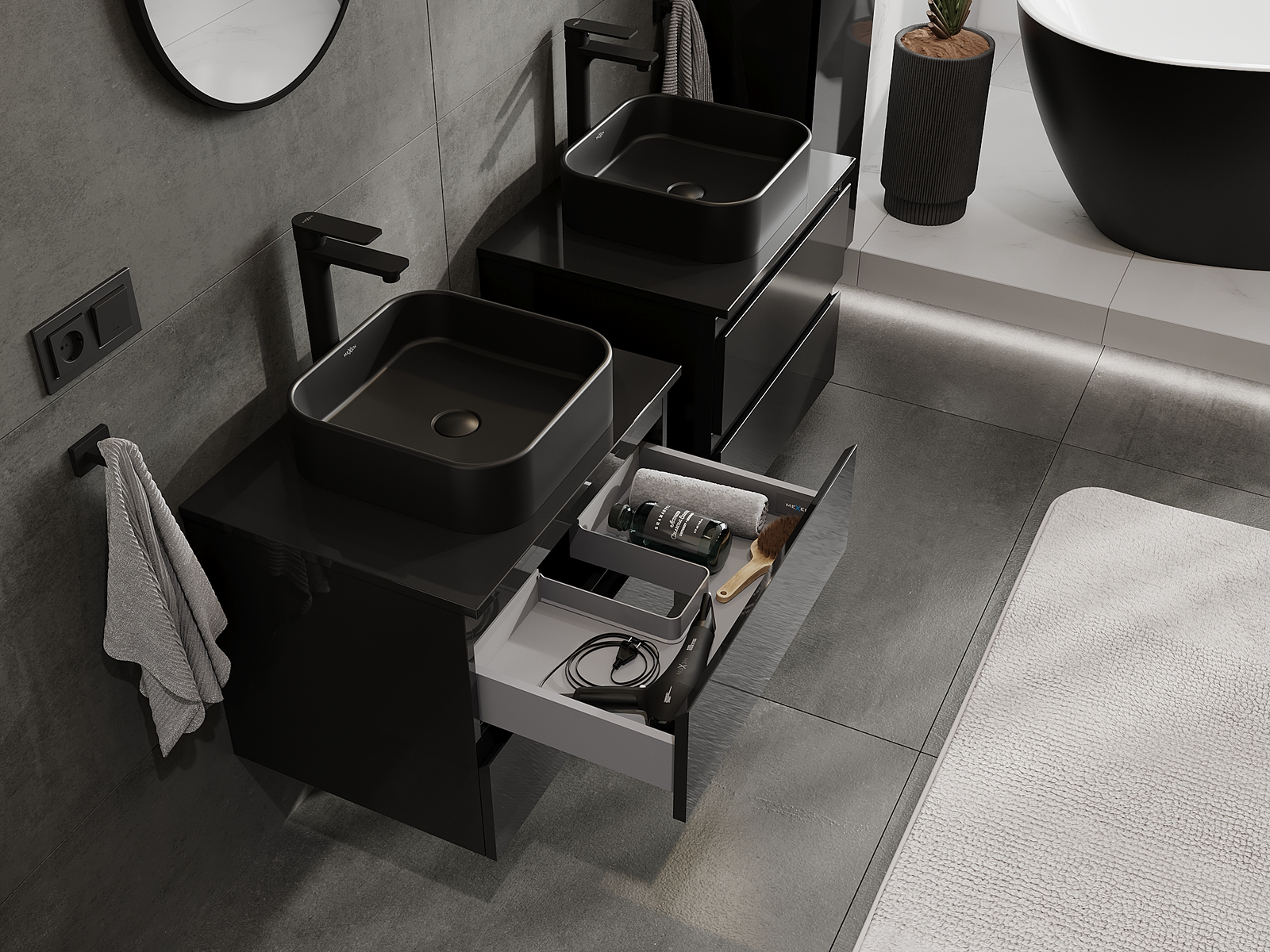 Mexen Orio kylpyhuonekaappi pesualtaan alle 60 cm, 2 laatikkoa, musta kiiltävä - 91A10-06047-2-BFF70